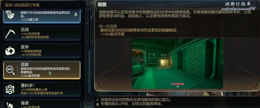 觀察:觀察技能可以發現場景中的隱藏物品和對話中的細微線索。升級觀察技能可解鎖相關專長,讓你獲取更多戰利品、追蹤敵人,以及更有效地利用敵方弱點。