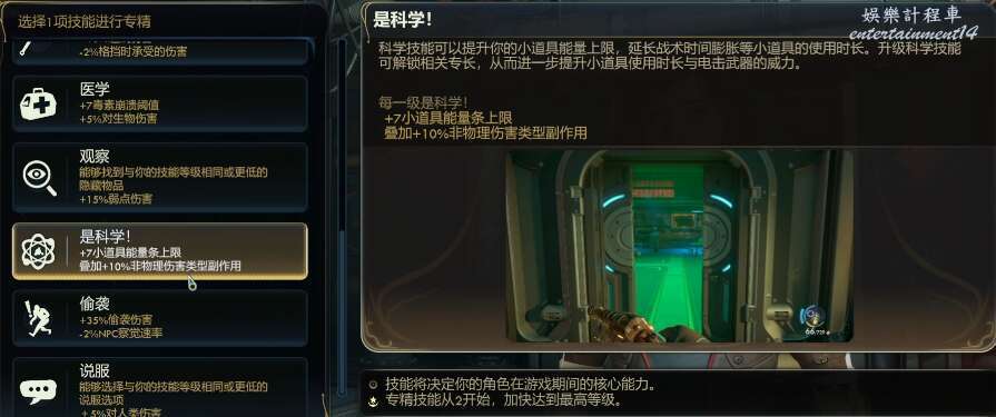 是科學:科學技能可以提升你的小道具能量上限,延長戰術時間膨脹等小道具的使用時長。升級科學技能