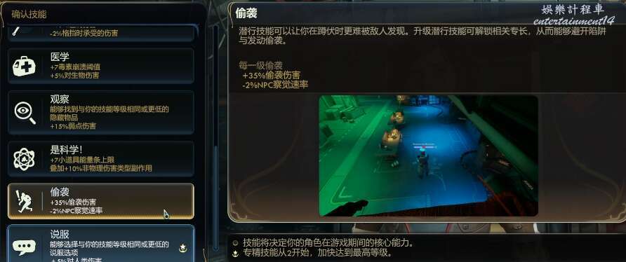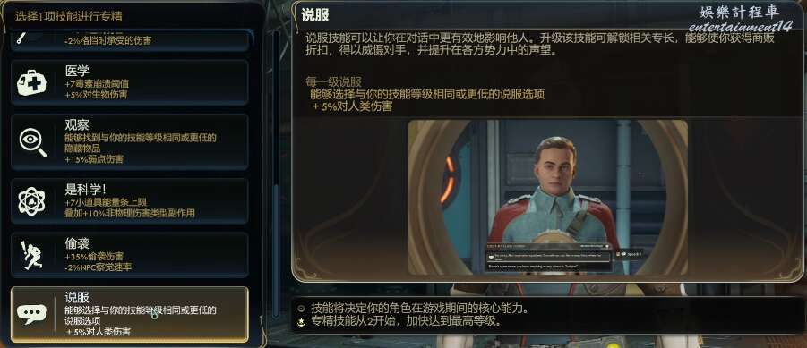 說服:說服技能可以讓你在對話中更有效地影響他人。升級該技能可解鎖相關專長,能夠使你獲得商販折扣,得以威懾對手,並提升在各方勢力中的聲望。