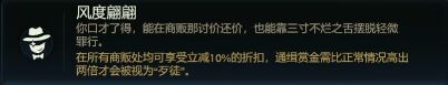 在所有商販處均可享受立減10%的折扣,通組賞金需比正常情況高出兩倍才會被視為“歹徒”。