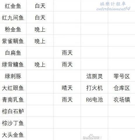 然後是個人總結的不同種類的魚的垂釣條件,空白表示無條件,天氣可以通過睡覺來刷,風暴同理。。