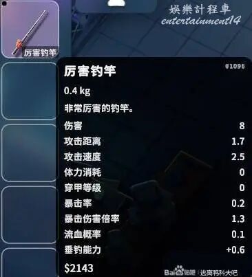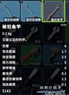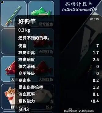 接下來是三種魚竿的介紹,破舊魚竿可以通過舔包獲得,好釣竿可以通過廚師佛哥的任務解鎖藍圖製作,厲害魚竿可通過開戰術刀具箱獲得。好點的魚竿可增加一定的垂釣能力,不過垂釣屬性對釣魚的影響不大。