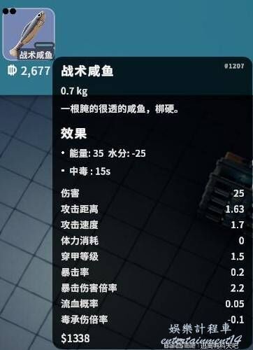 最後是獲得的魚的用途介紹。在廚師佛哥處升級生存技能可降低能量和水分消耗速度,還可以用魚在醫療站搓各種抗屬性針,在工作台搓各種屬性雷。