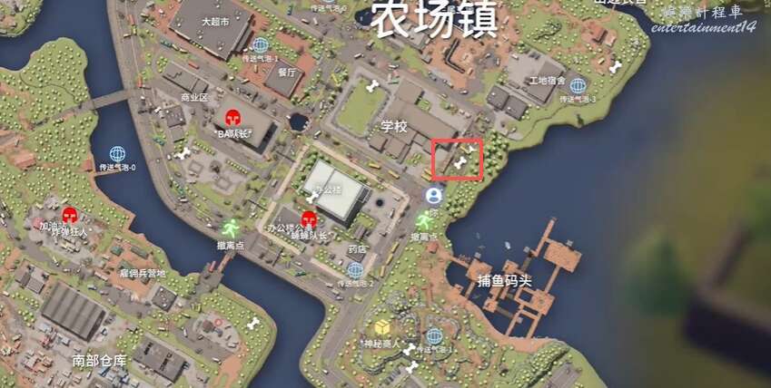 玩家前往學校右側下圖所示區域,過來後靠近藏匿點,直接使用道具鏟子即可。