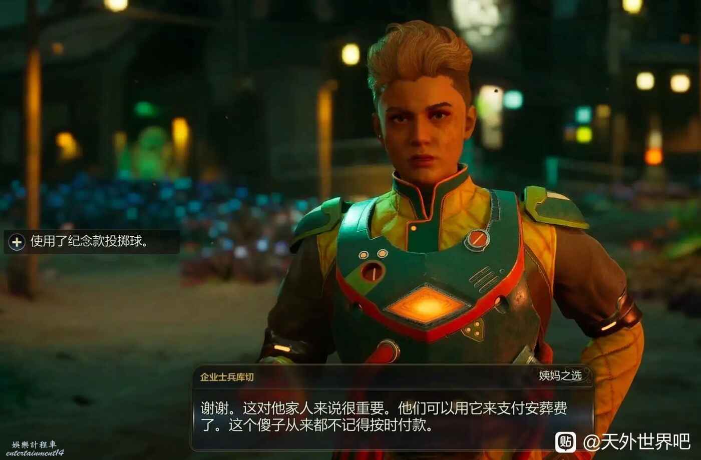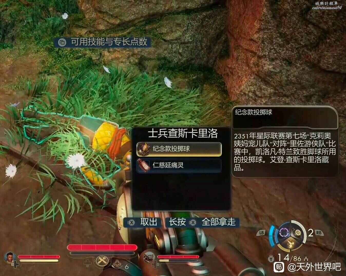 天外世界 2 紀念款投擲球獲取方法 30 10 月 2025-10-30 廣告 作者:貼吧用戶_Q1AUy73 來源:天外世界吧 在第一章,那個小鎮的門口會有一個企業士兵庫切會來盤問,與她對話提到發現一群機器人襲擊了另一隊士兵,而後的對話中會有一個選項,其需要擁有紀念版投擲球才能解鎖,這個紀念款投擲球在降落平台所在區域的大門口外,從大門口出發,走一小段路就能在旁邊的草叢中發現士兵查斯卡裡洛的屍體,他身上就有紀念款投擲球。 後續:將他交給企業士兵庫切後他會說出如圖對話並新增1點(表詳細數量而並非意指大體數量)在姨媽之選的聲望。