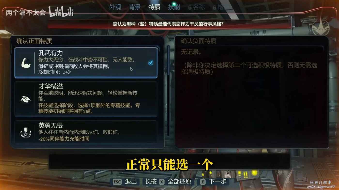 正常只能選一個,如果你選兩個就必須帶一個負面的,目前來看弱智和體弱多病影響不大,弱智雖然鎖定技能,實際上你也只能點幾個,體弱多病的話減血上限和毒素溢值,普通難度敵人傷害不高不差這點血,最高難度敵人2槍秒人也不差這點血,所以建議點兩個增益然後負面選這兩個其中一個,增益方面推薦一個幸運之人,很多技能不達標的情況下都會有個亂敲亂砸的過關選項。