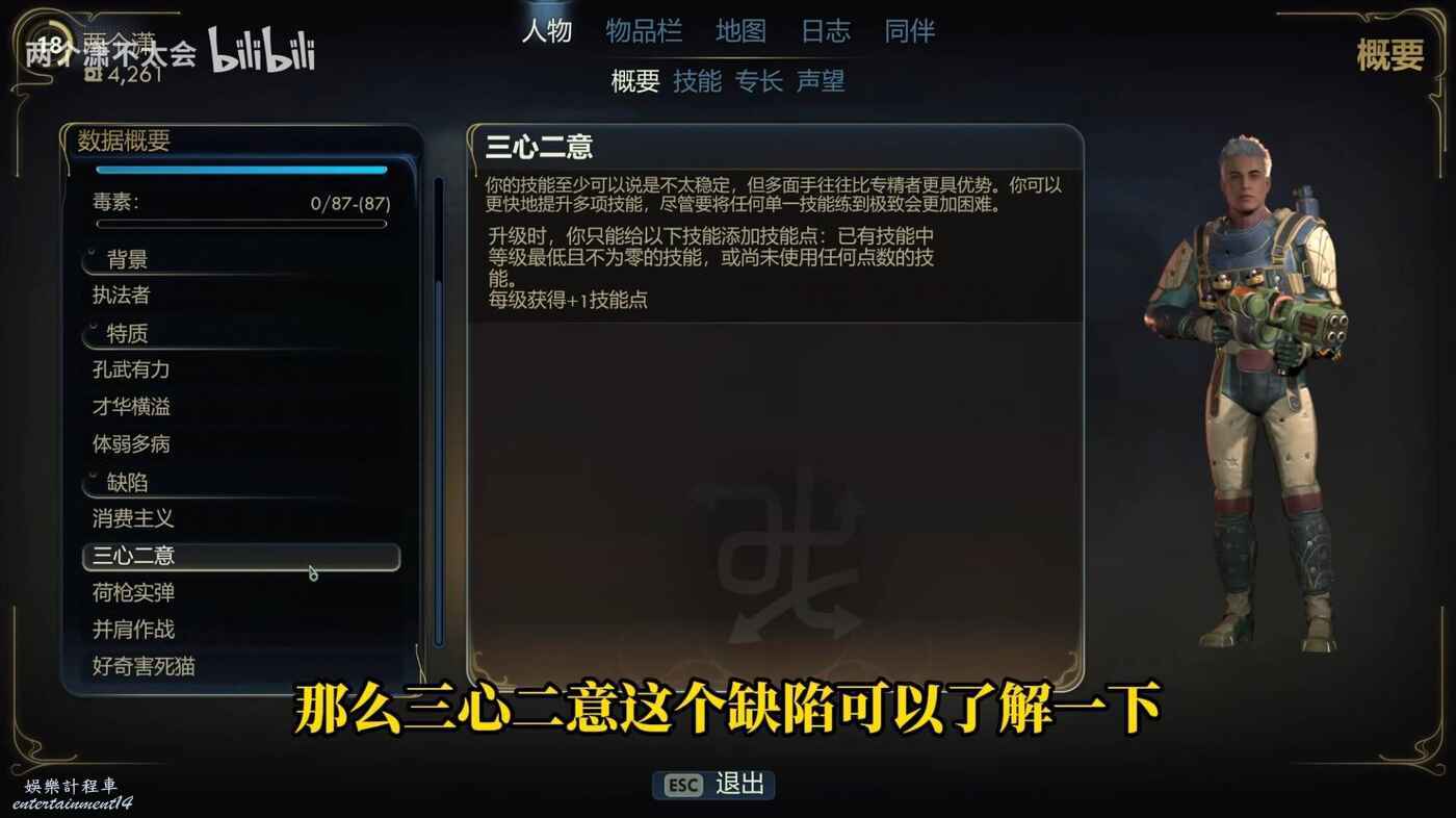 這裡補充說明下,如果你跟我一樣想更多的體驗劇情,那麼三心二意這個缺陷可以了解一下,它能夠讓你每級多一個技能點,4級可以觸發相當於多了26個技能點,限制就是不可能有技能點到滿級。觸發條件是開局選擇才華橫溢,然後平均5個技能各點2點就可以了。