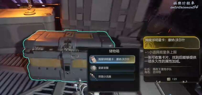 天外世界 2 康納沃爾什明星卡獲得方式 30 10 月 2025-10-30 廣告 來源:互聯網 前往天堂島裂天塔如圖所示位置。 進入此處的屋子開始探索。 找到屋子裡邊的升降電梯,操作之後進入電梯到頂層。 出電梯直行,前往右邊的寶箱位置。 康納沃爾什明星卡就在寶箱內。 拋接球明星卡:康納沃爾什 +1小道具能量條上限 一張可收集卡片,找到後能夠提供一項永久性的屬性加成。
