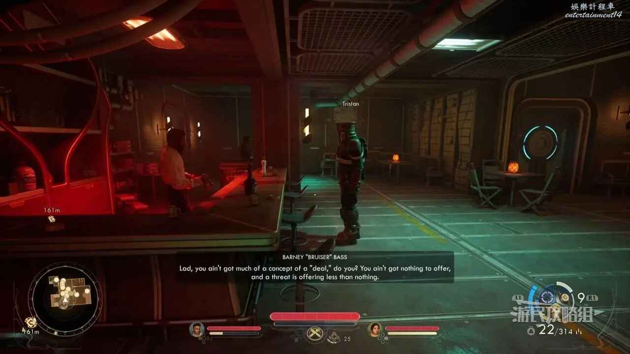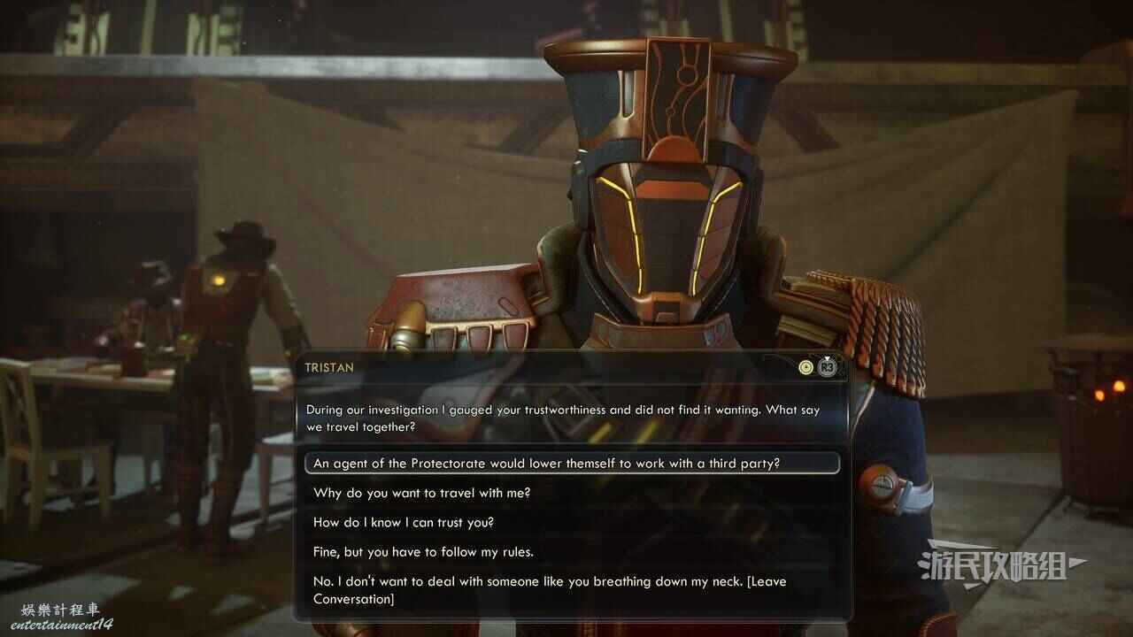 在起降平台通往自由市場沿線的酒吧內,找到正與酒保爭執的特裡斯坦。通過對話說服酒保讓他和情報販子見面,並完成調查金脊嶺營地的委託。抵達標記營地與特裡斯坦匯合調查襲擊事件,整理線索後返回酒吧與情報販子對話,即可邀請特裡斯坦加入隊伍。