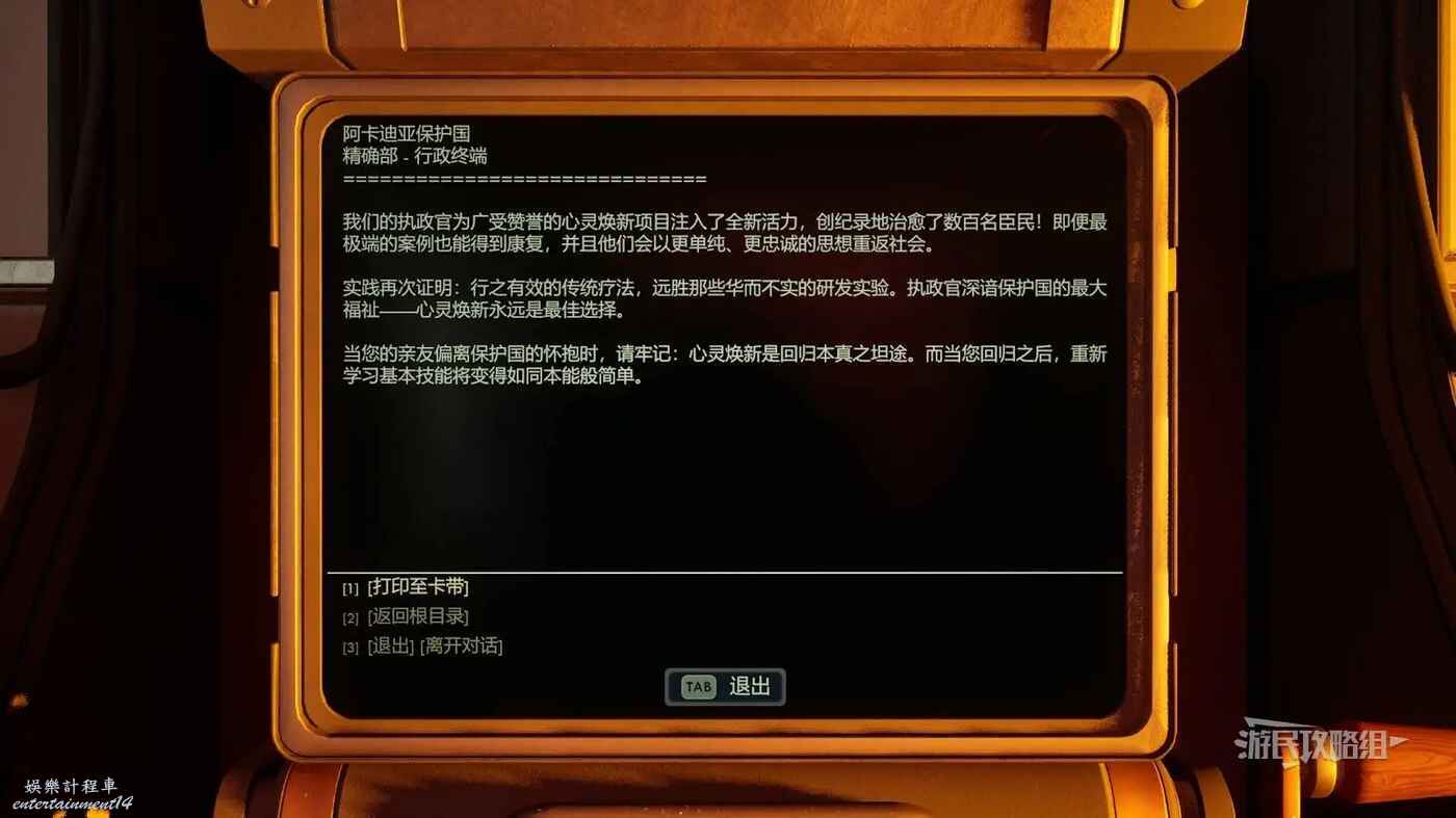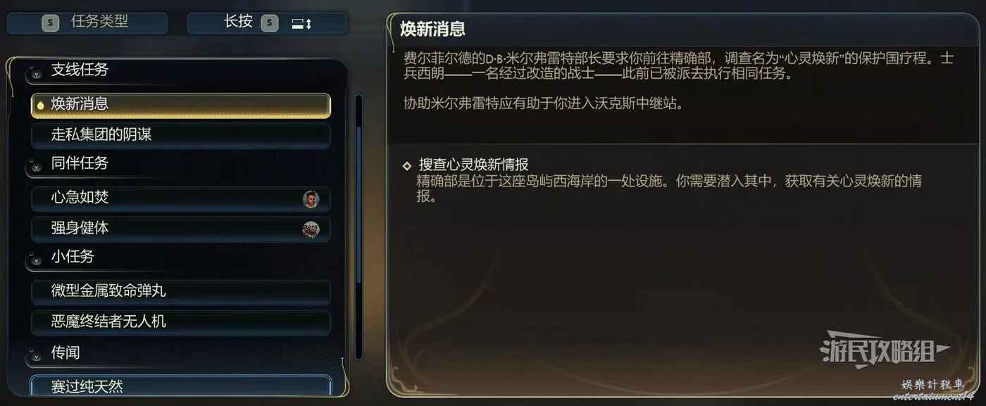 繼續追蹤任務【煥新消息】,深入精確部設施找到終端機(進入伊內茲所在位置旁邊的門一直爬梯子到三樓再跳回到一樓,中間需要跳過好幾個斷裂的平台),在終端機列印煥新報告後離開設施。
