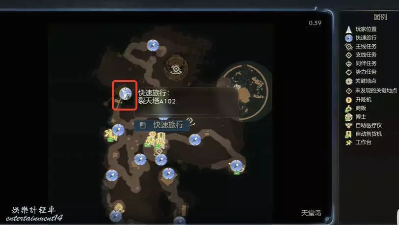 前往天堂島裂天塔如圖所示位置。