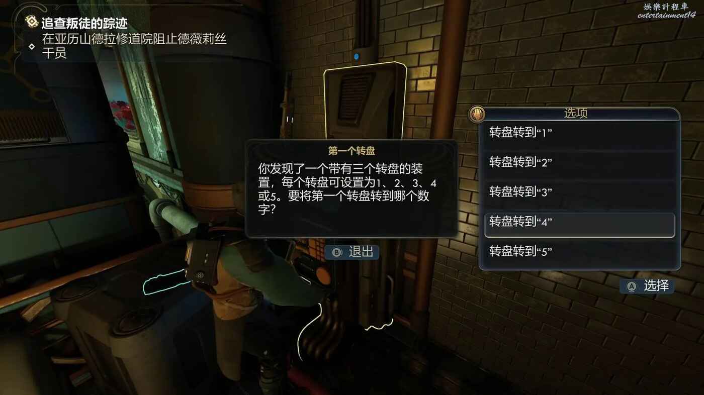 天外世界 2 修道院星圖室密題答案分享 30 10 月 2025-10-30 廣告 作者:迪亞哥布蘭度SBR 來源:bilibili 答案在身後門口的星象儀上面,這片的轉盤我完全沒看明白去門外看的 第一位:門外星象儀,樂土星有四個個衛星所以是4 第二位:只有一個衛星在金輝星和樂土星之間,所以是1 第三位:轉了四圈所以是4 最後答案414