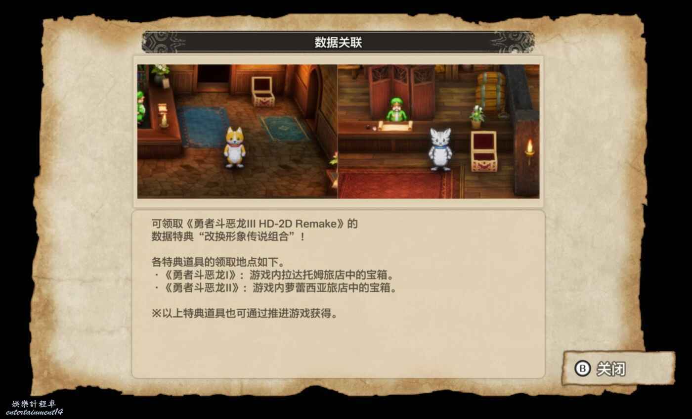 注:本特典僅適用於2024年發售的《勇者鬥惡龍III HD-2D Remake》的保存資料。2019年之前發售的《勇者鬥惡龍III 傳說的起點…》的保存資料不在適用範圍內。