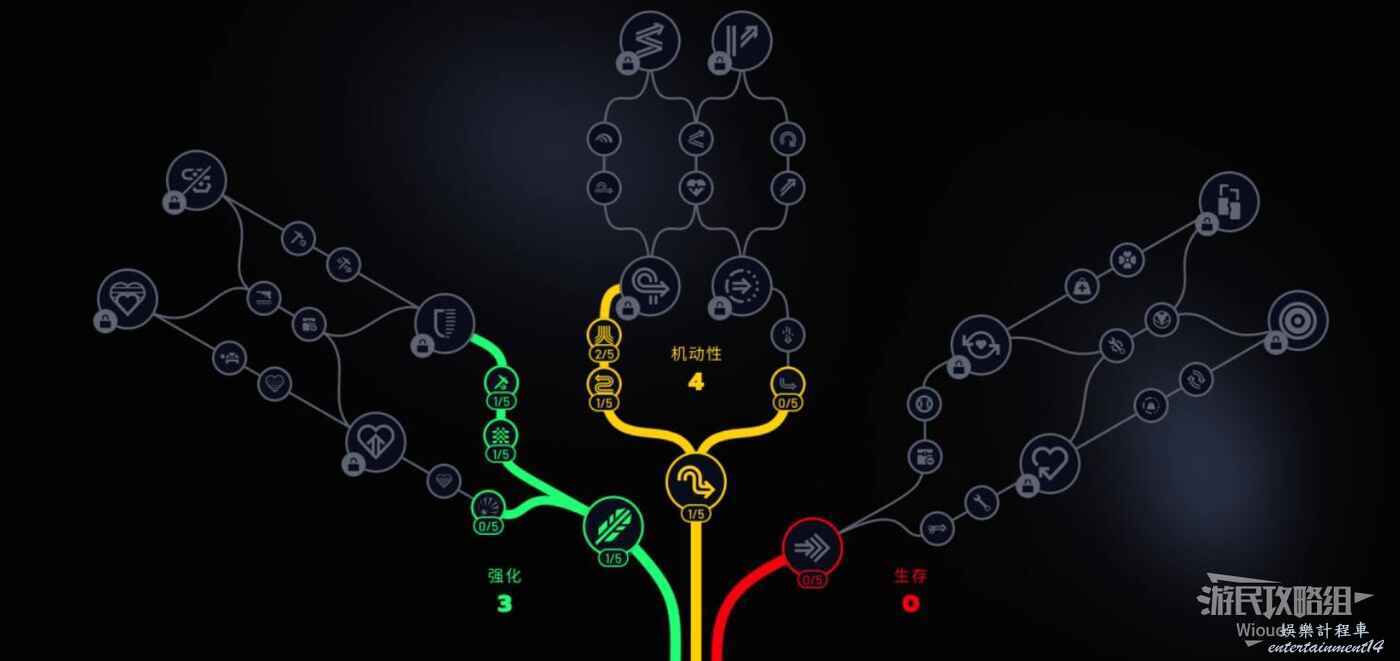 整體分為三個技能方向,當推進至中間階段時,需先累積足量同類已點亮技能點,才能解鎖後續節點。