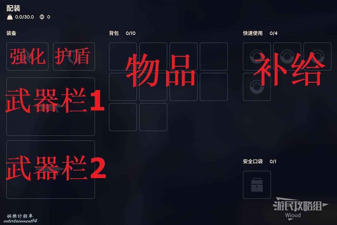 玩家的配裝分為三個部分,左側裝備欄,中間物品欄和右側補給品、安全口袋。