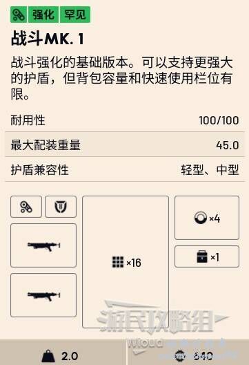 裝備由兩個主武器、強化裝備和護盾組成,物品欄如上述和強化裝備關係密切。