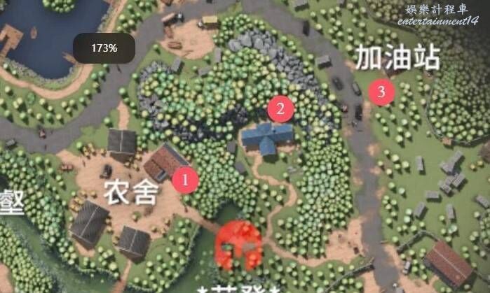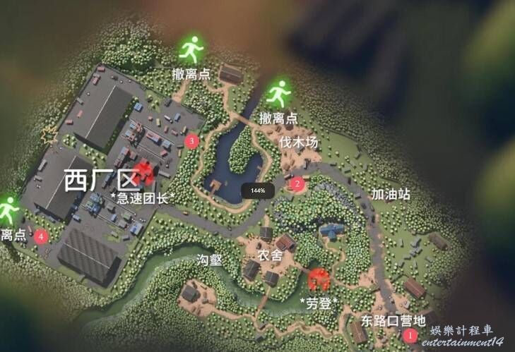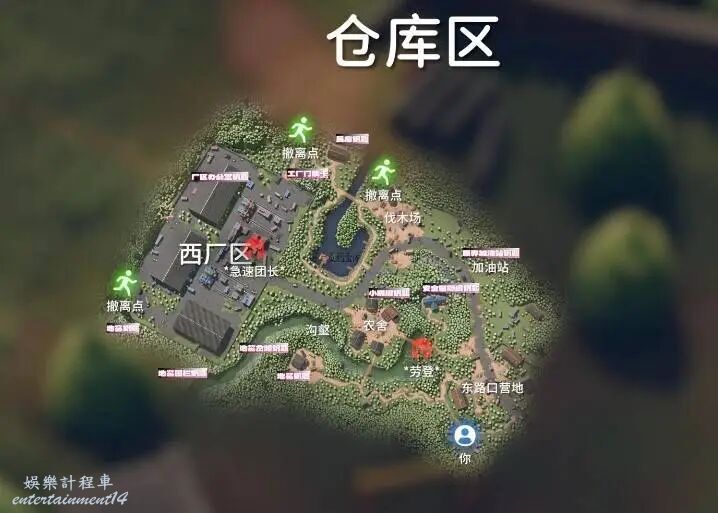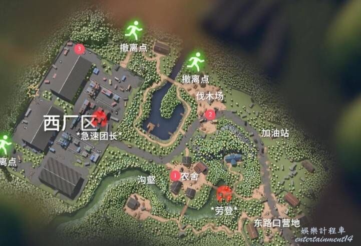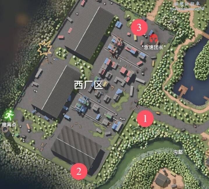 倉庫路線需要我們依次到西廠區的三個入口踩一下點,這個從地圖上可以一目了然的找到兩個,就是我標記的①和③。部分小夥伴可能會把廠區後面的爆破點當成入口,而浪費時間,實際位置是在廠區東南角也就是標記②的地方。