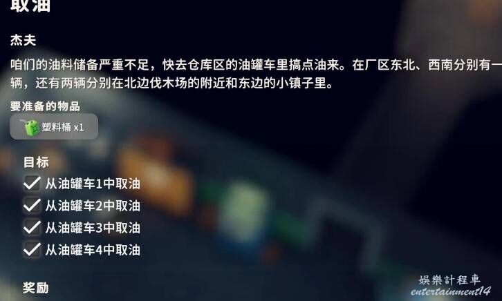 這個任務我覺得作者還是構思蠻巧妙的,帶著油桶到油罐車的油箱處取油即可,有點油耗子的那個味道了。也給大家挨著標出來了,大家可以按照①到④的順序依次拿,塑膠桶沒有可以直接在家裡奸商那裡買一個。