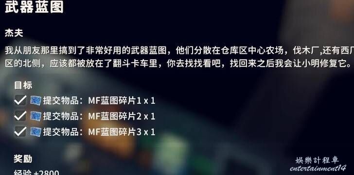 這個任務可以看做是上面油任務的簡化版,在三個翻斗車裡面找三個武器碎片,完成會解鎖前中期個人認為最好用的MF,建議優先完成。