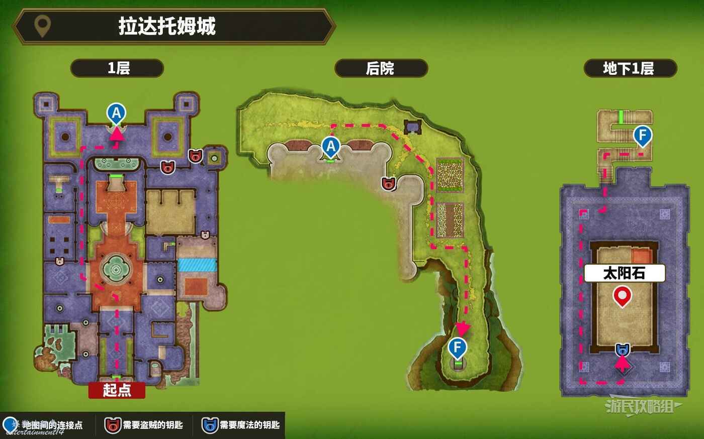 獲得魔法的鑰匙後前往達拉托姆城。從城堡深處穿過後院往南走,可以在地下1層的房間裡獲得【太陽石】。