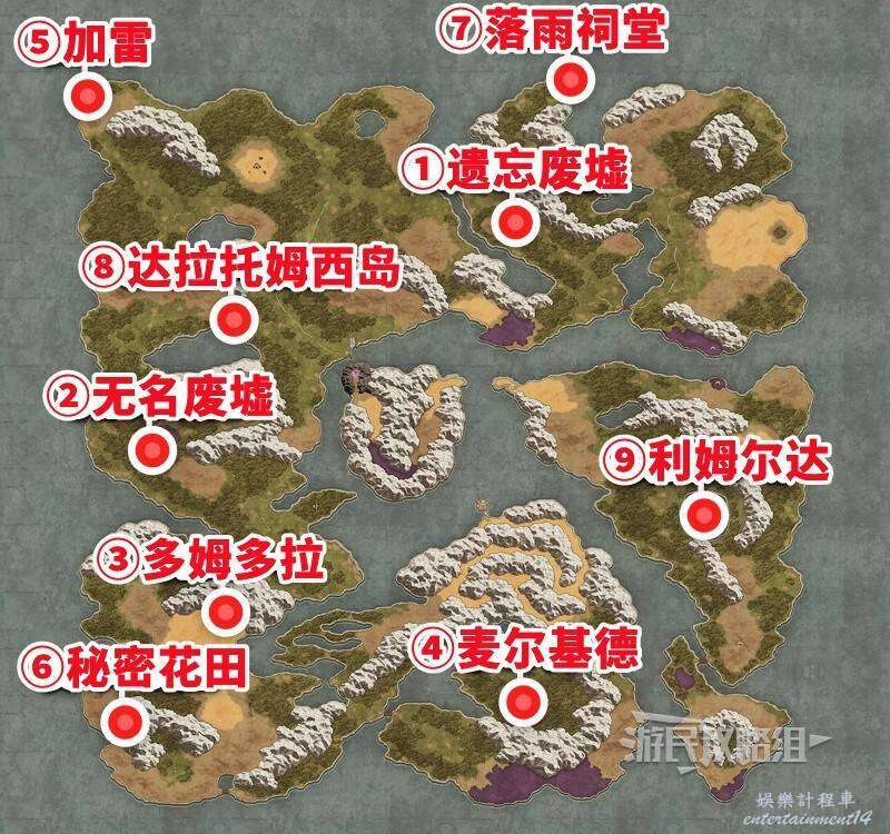 正確順序為:遺忘廢墟→無名廢墟→多姆朵拉→麥爾吉德→加雷→秘密花田→落雨祠堂→達拉托姆西之島→利姆爾達