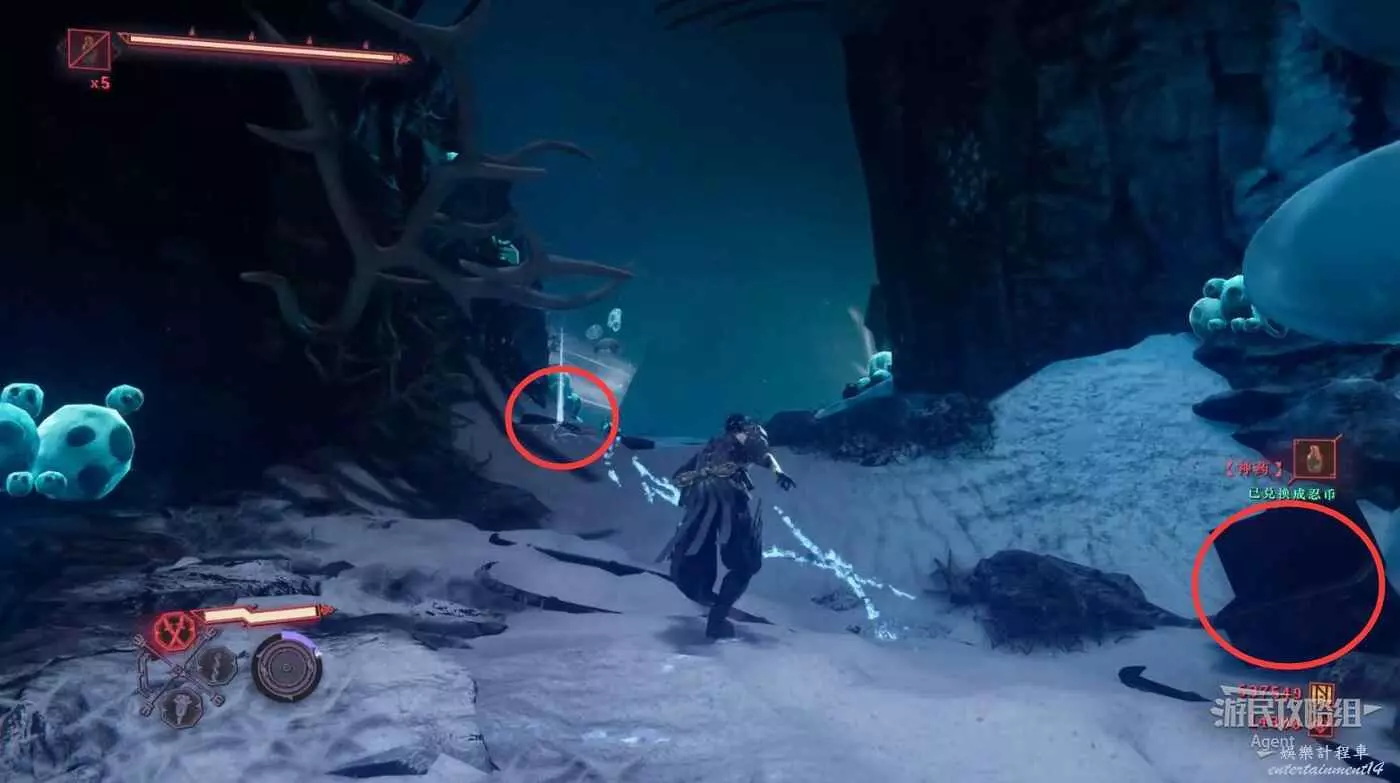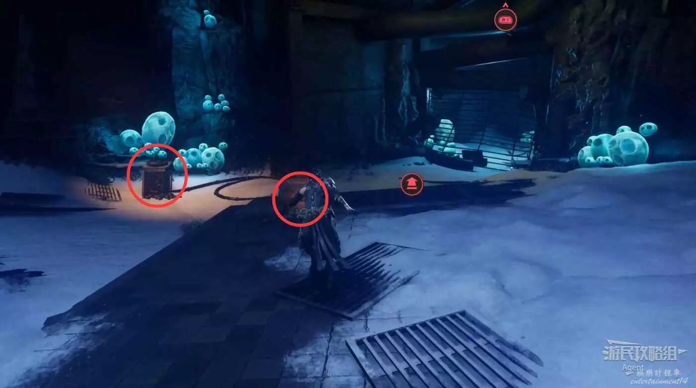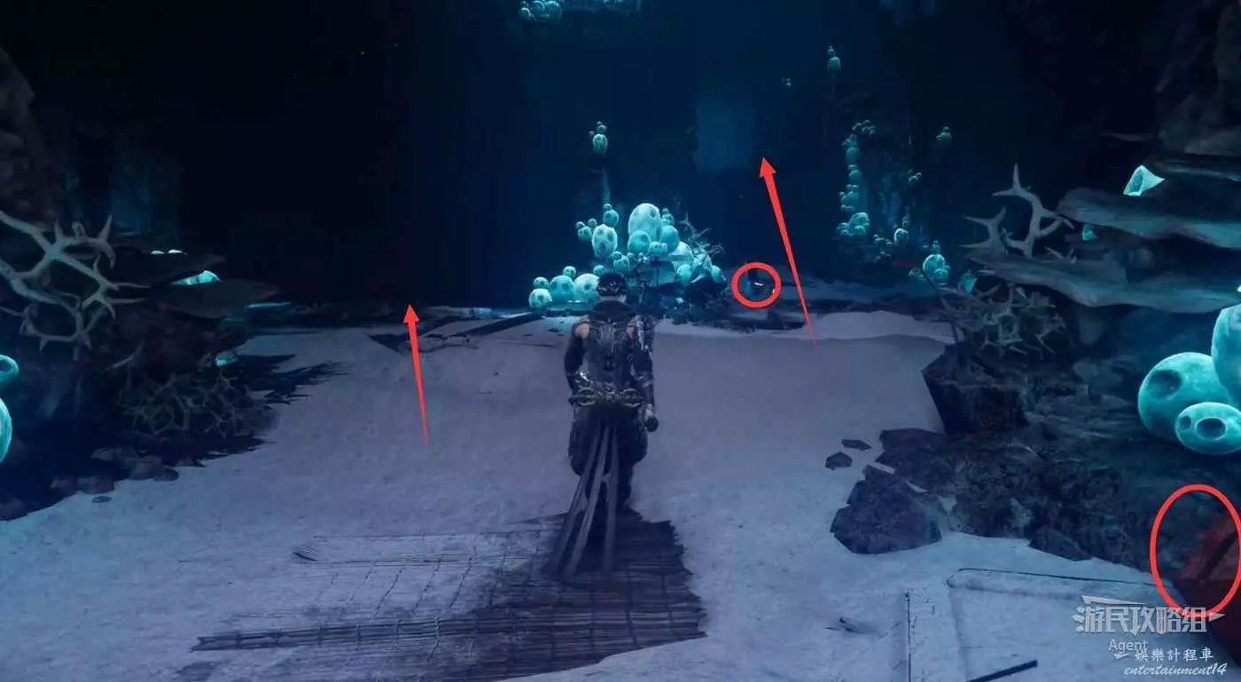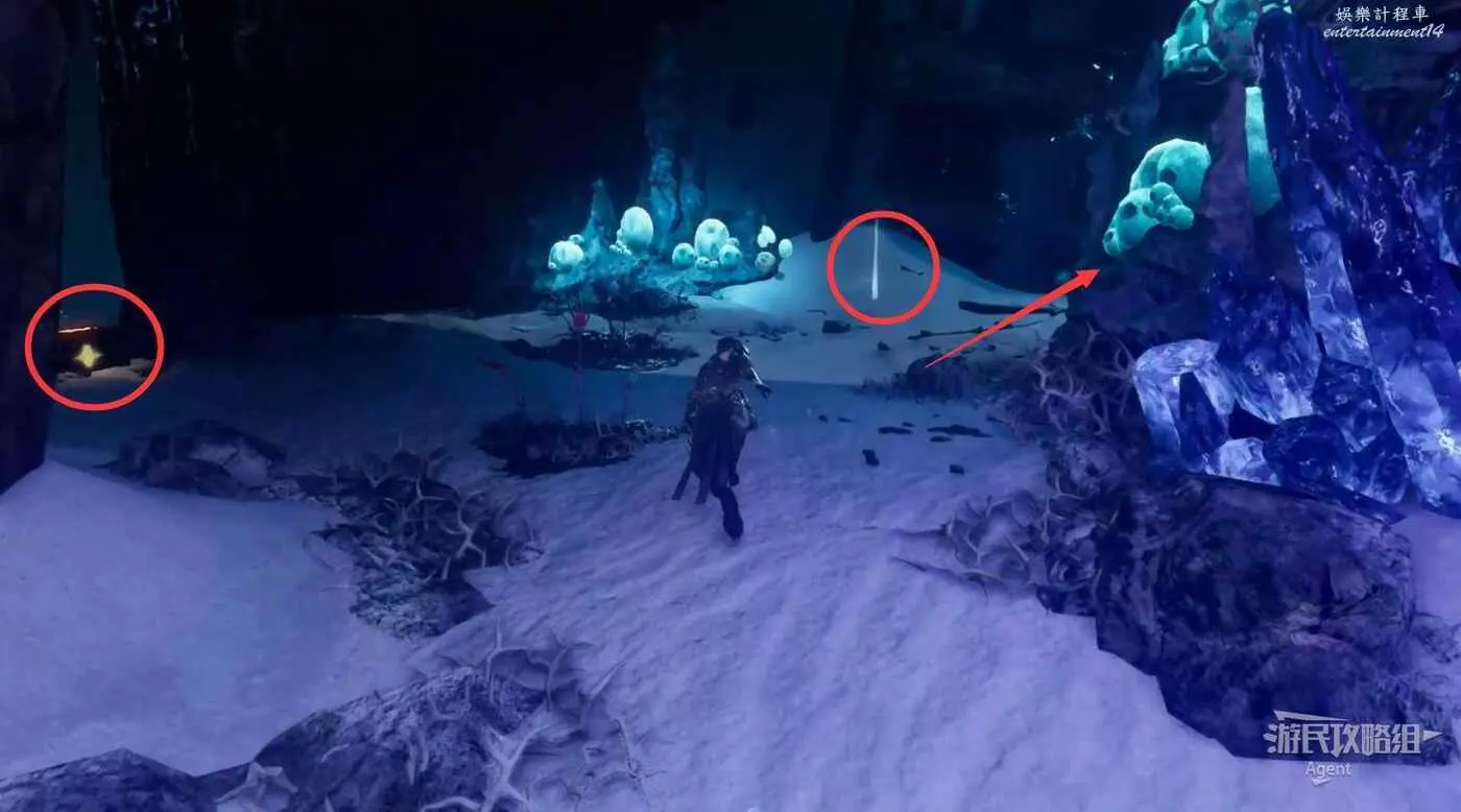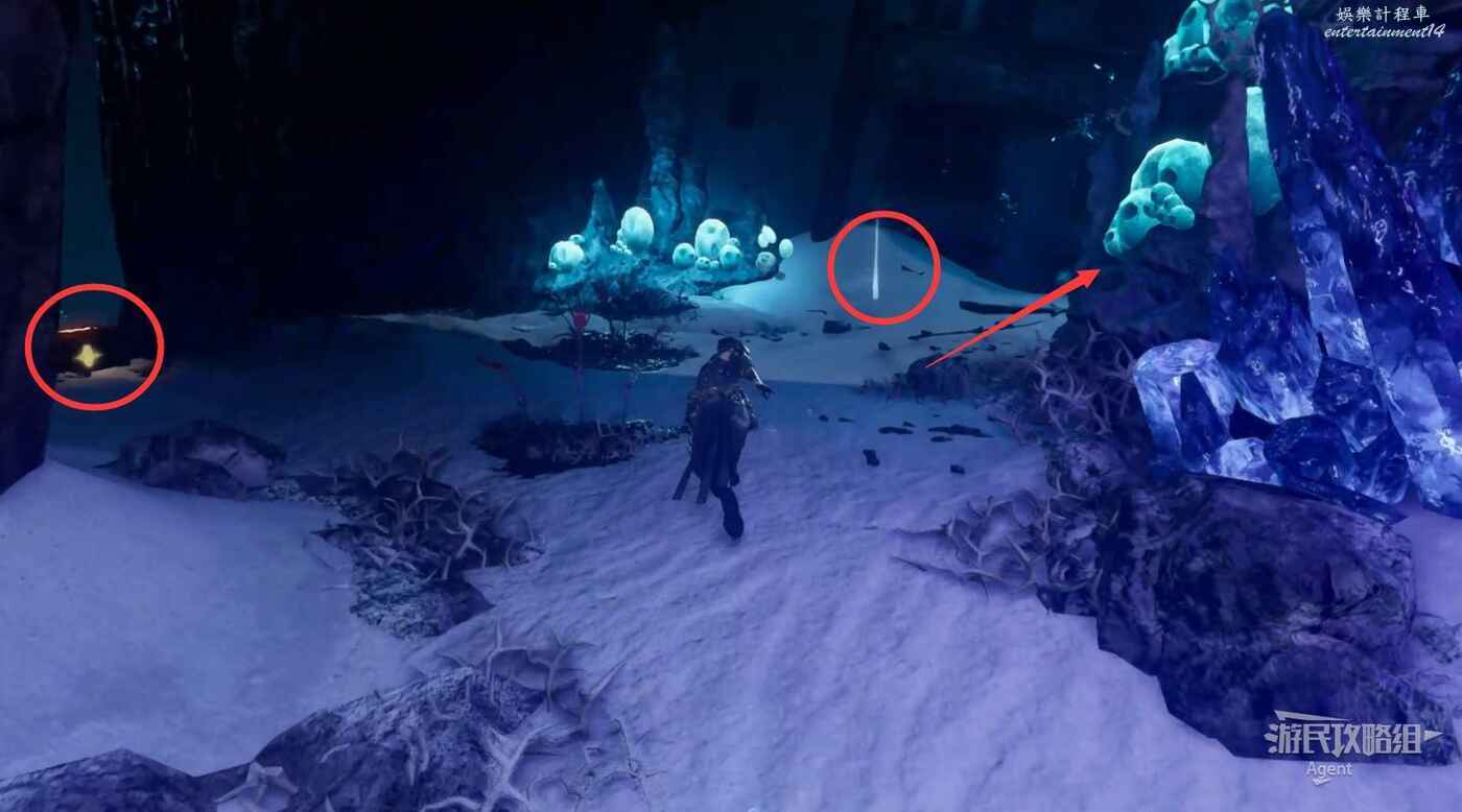 沿發光痕跡經過前方的縫隙後,先往左走。我們從左至右按順時針探索一圈。