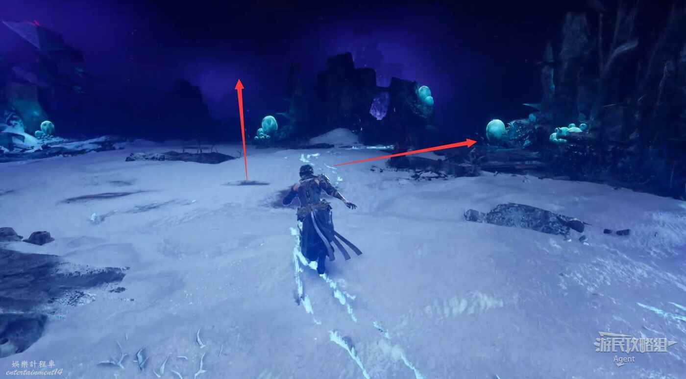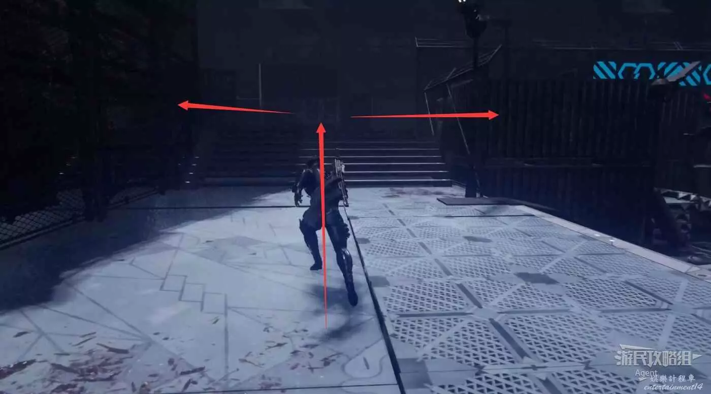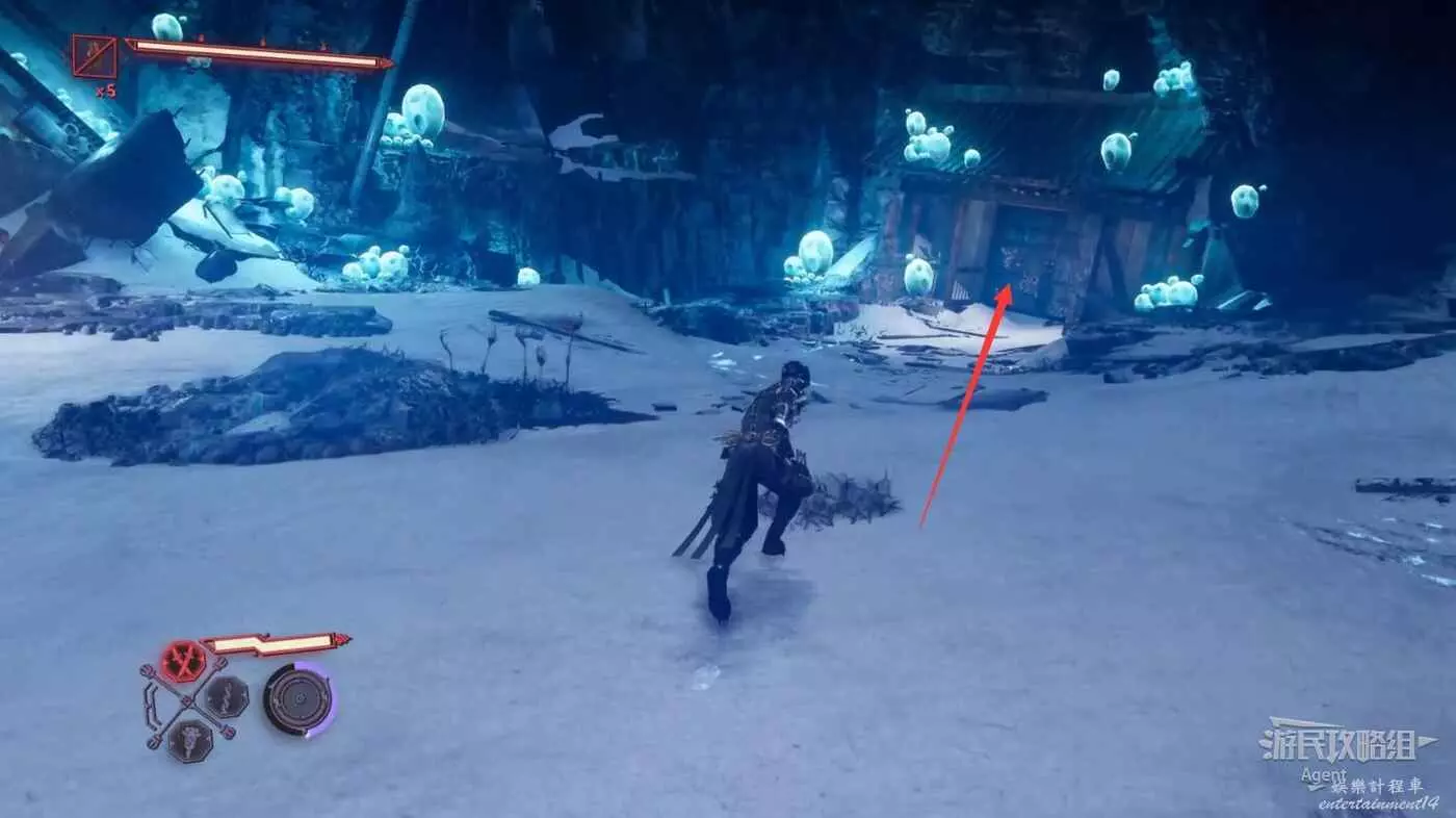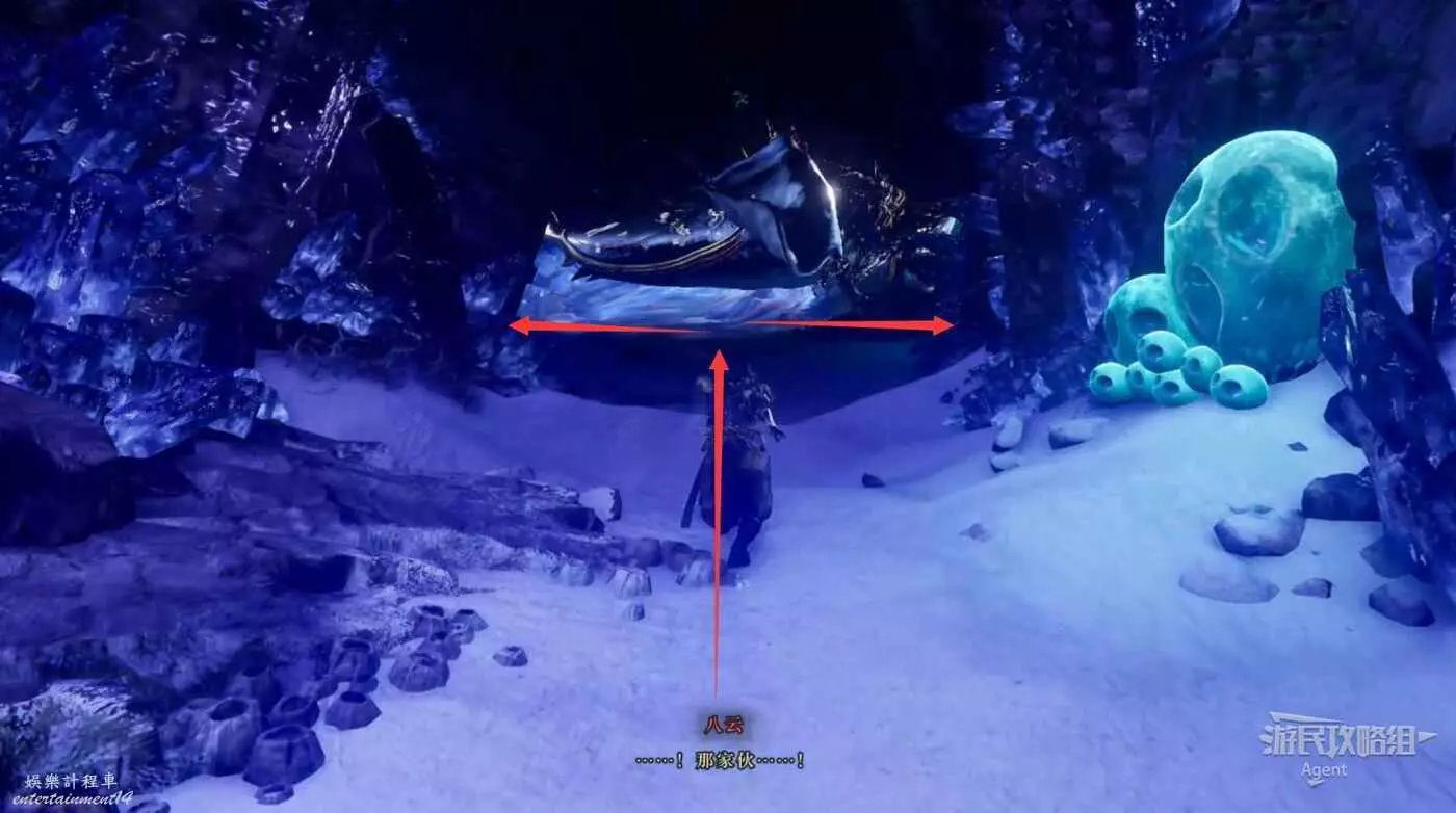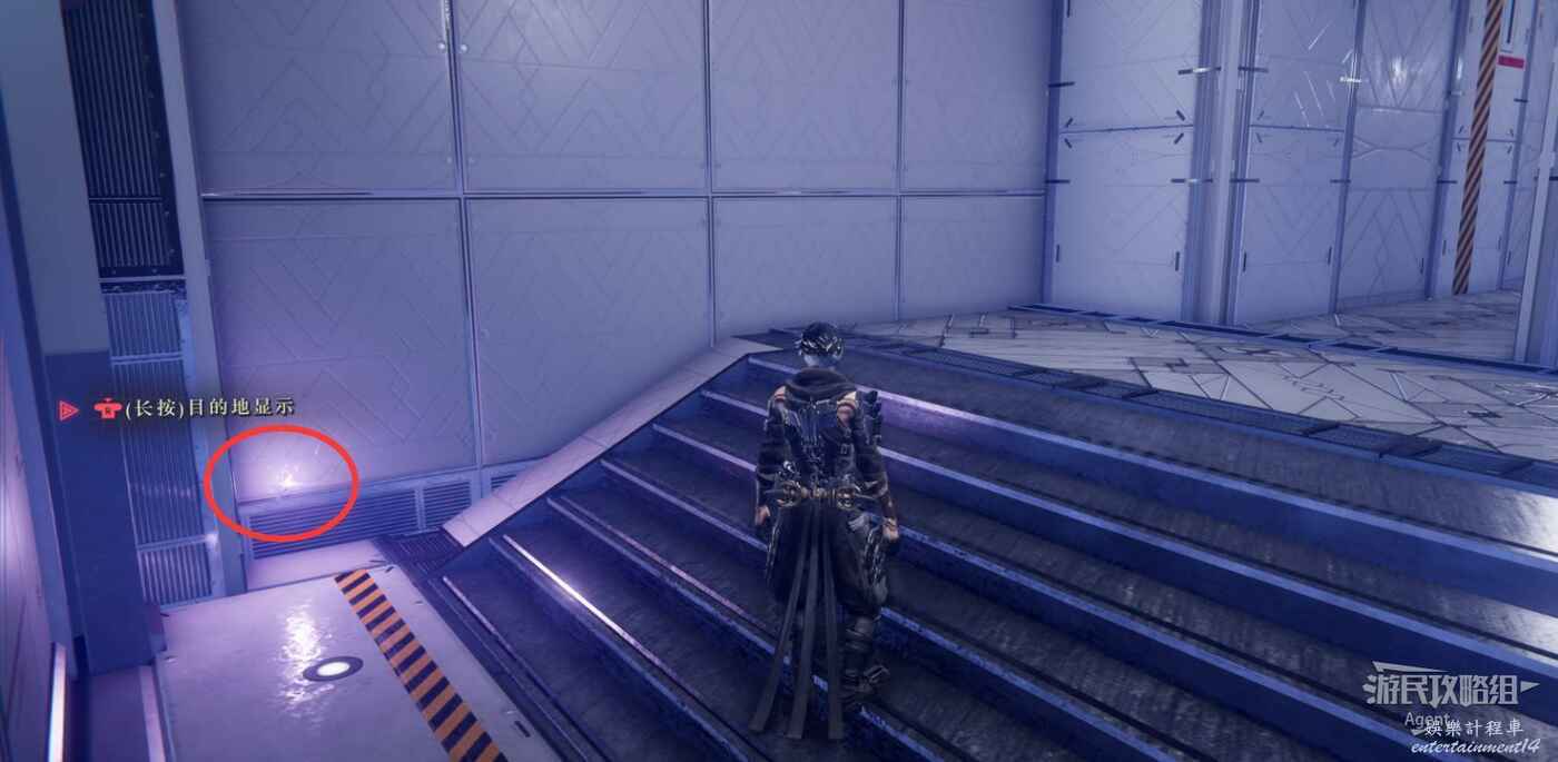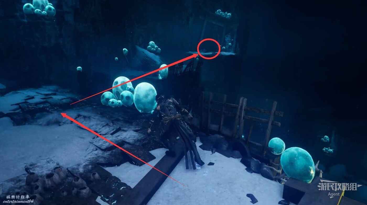 沿發光痕跡經過前方的縫隙後,先往左走。我們從左至右按順時針探索一圈。