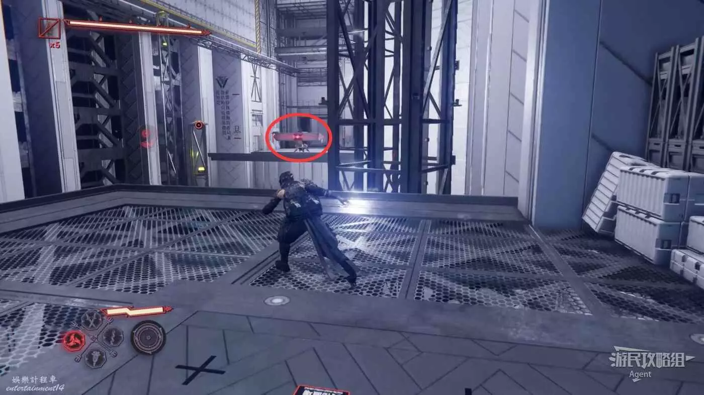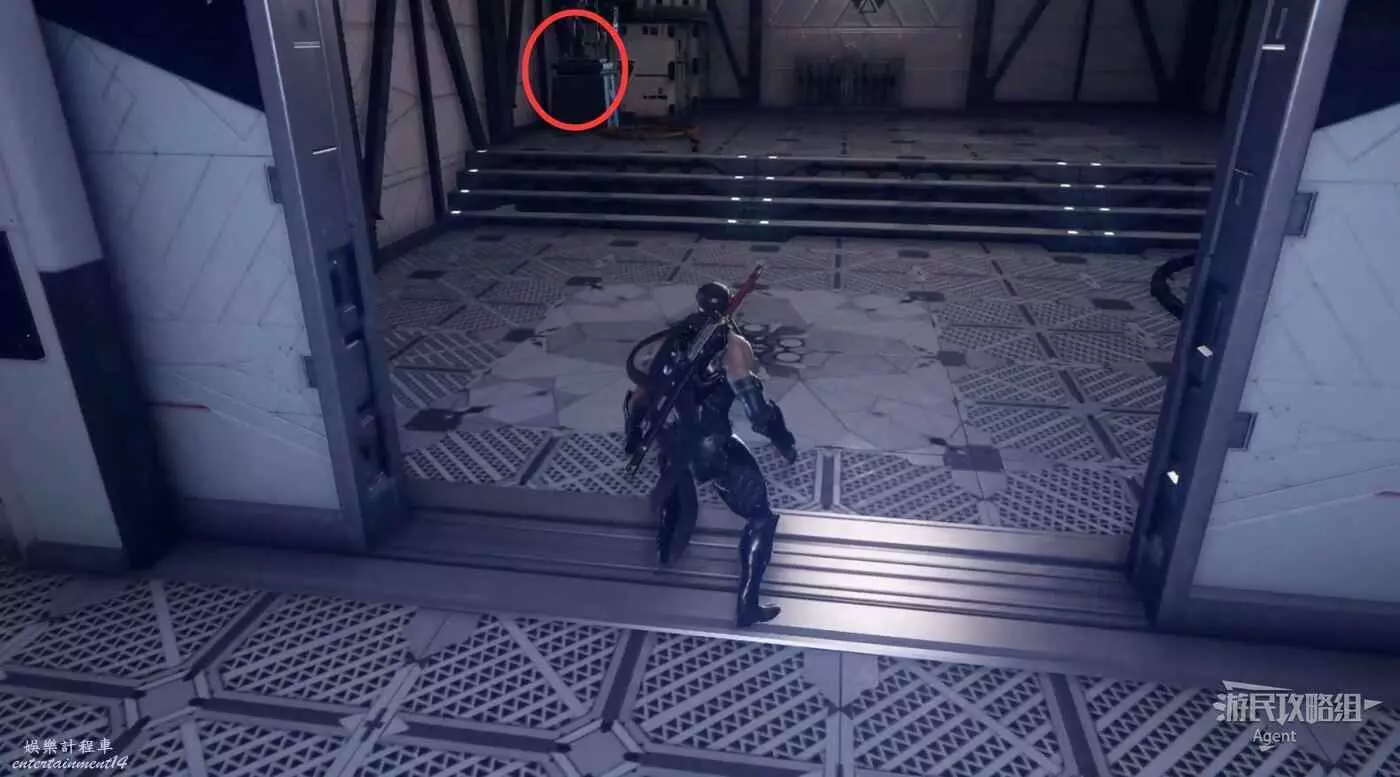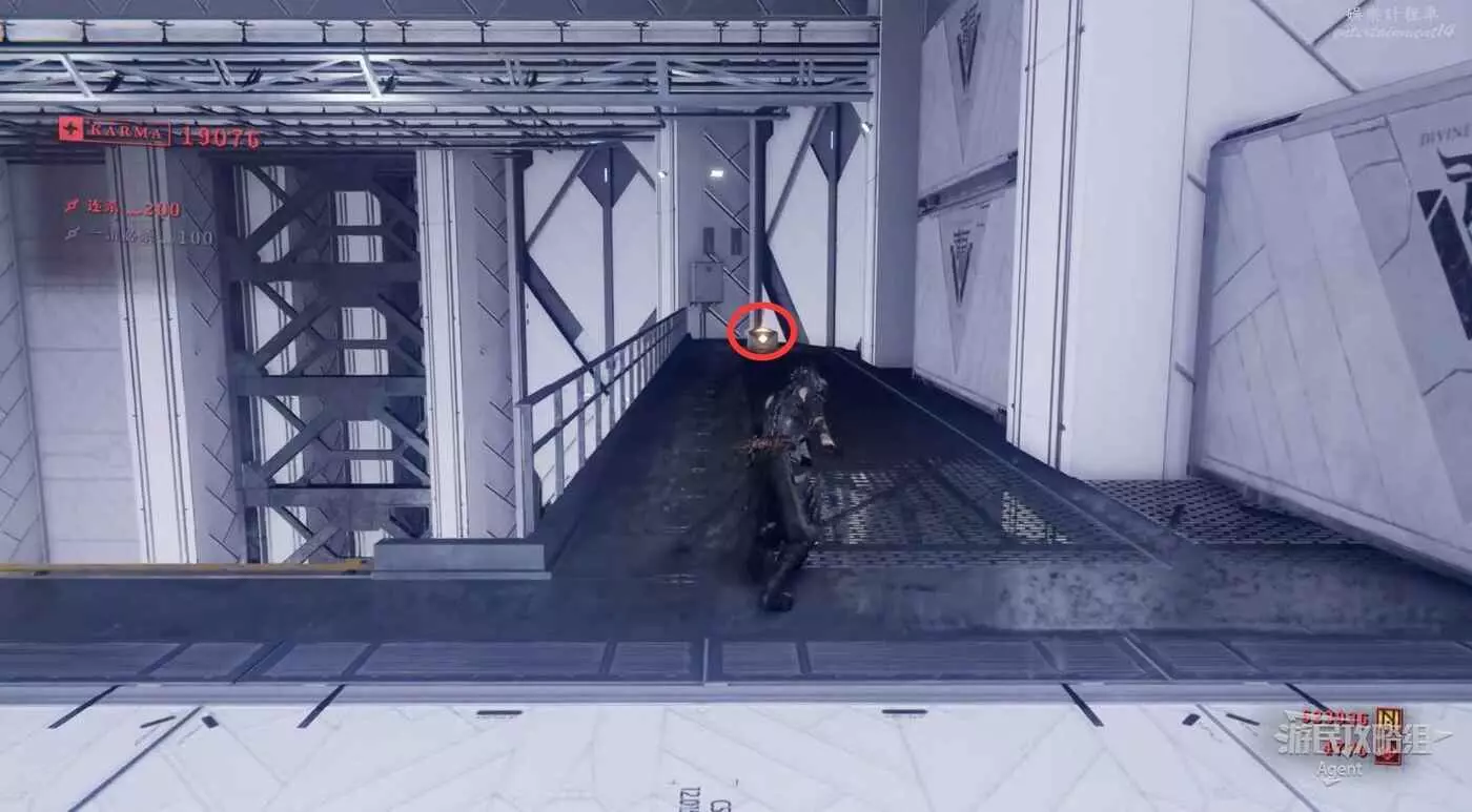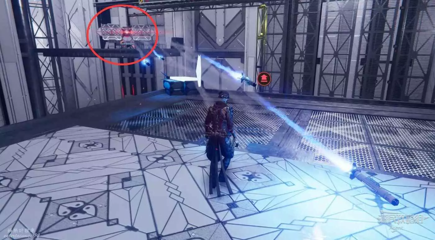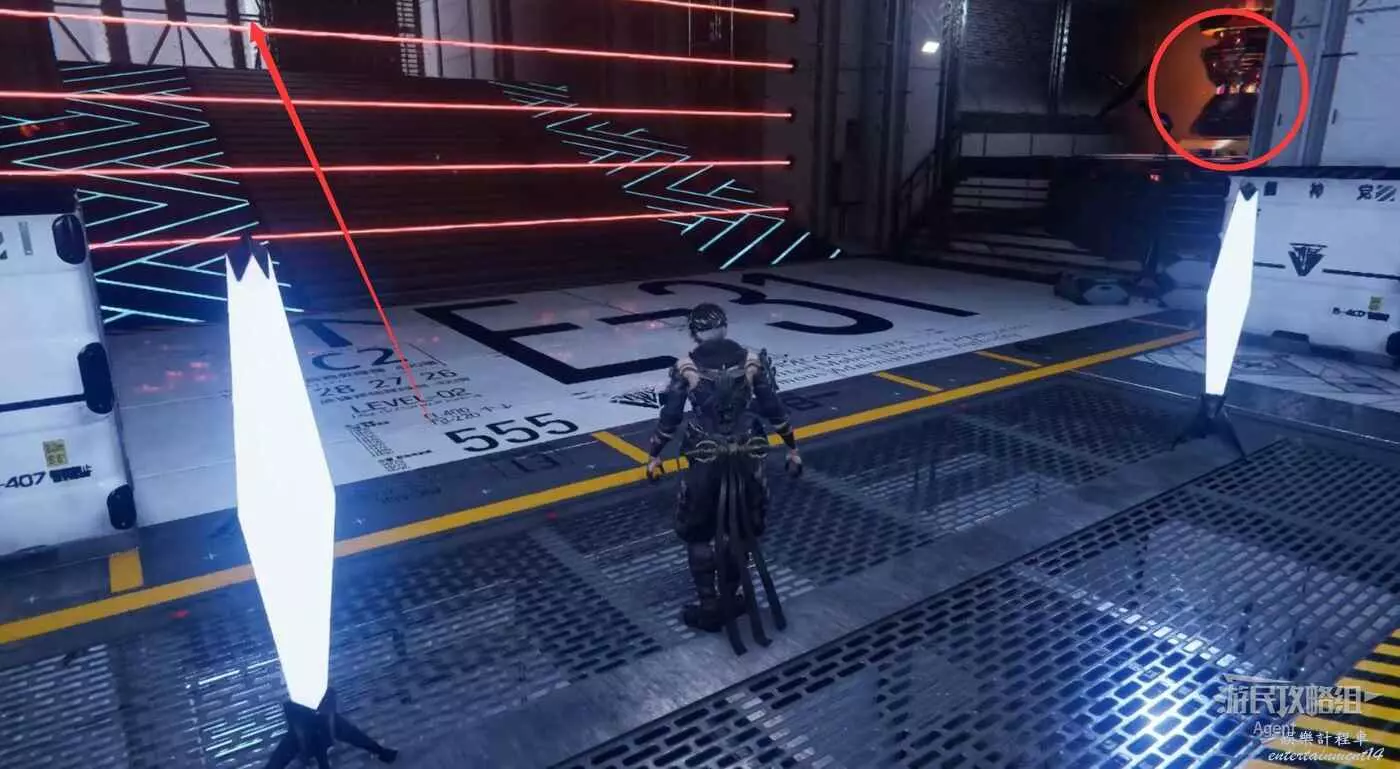 再往前走還有第四台D-0037先驅者,跳上豎井後,用暗器隔著鐳射摧毀機關,鐳射就會暫時關閉,進去拿個寶箱。