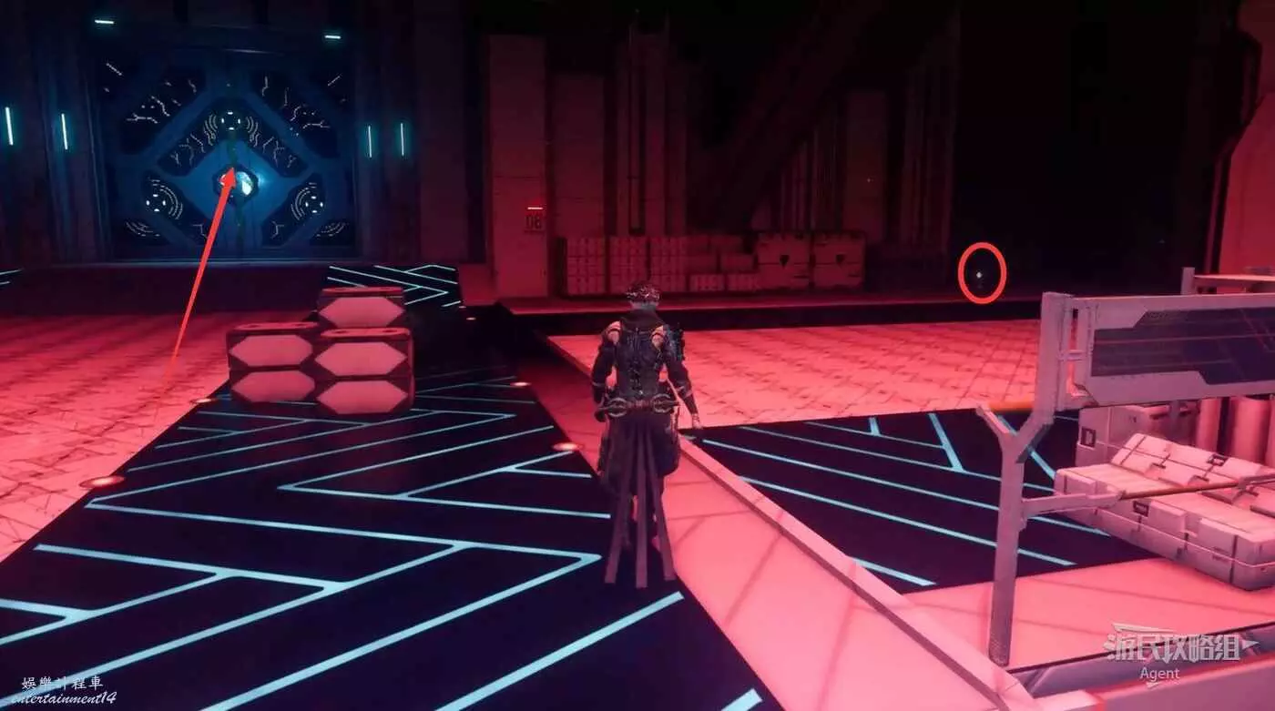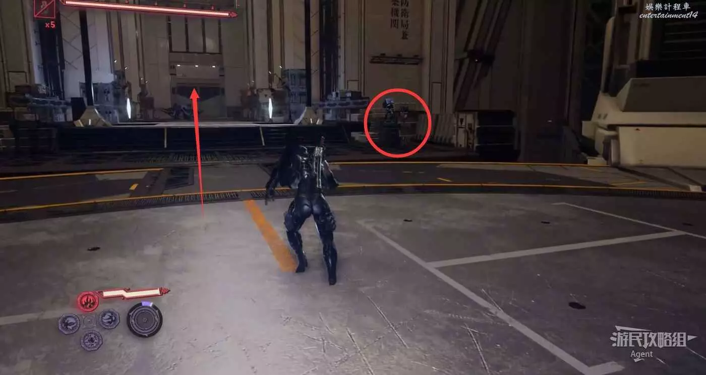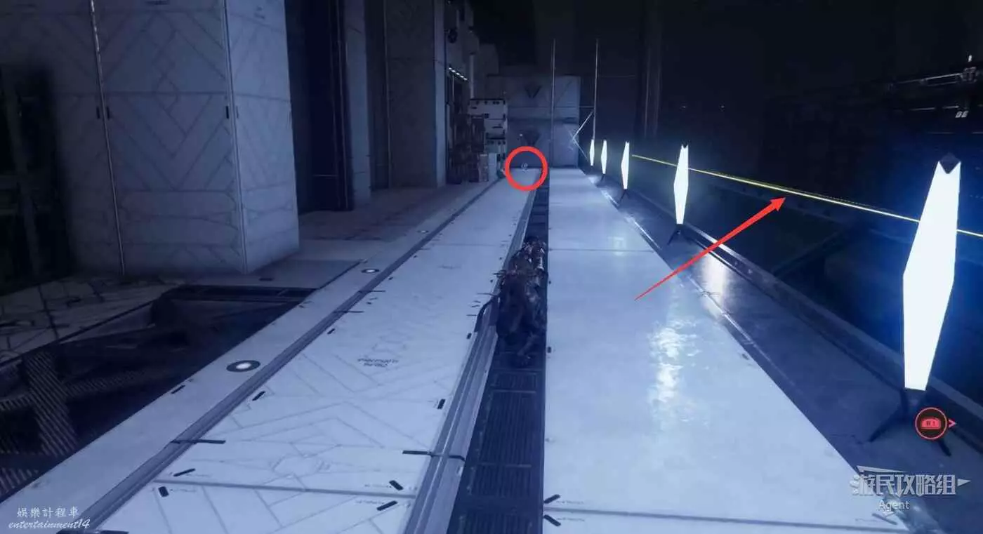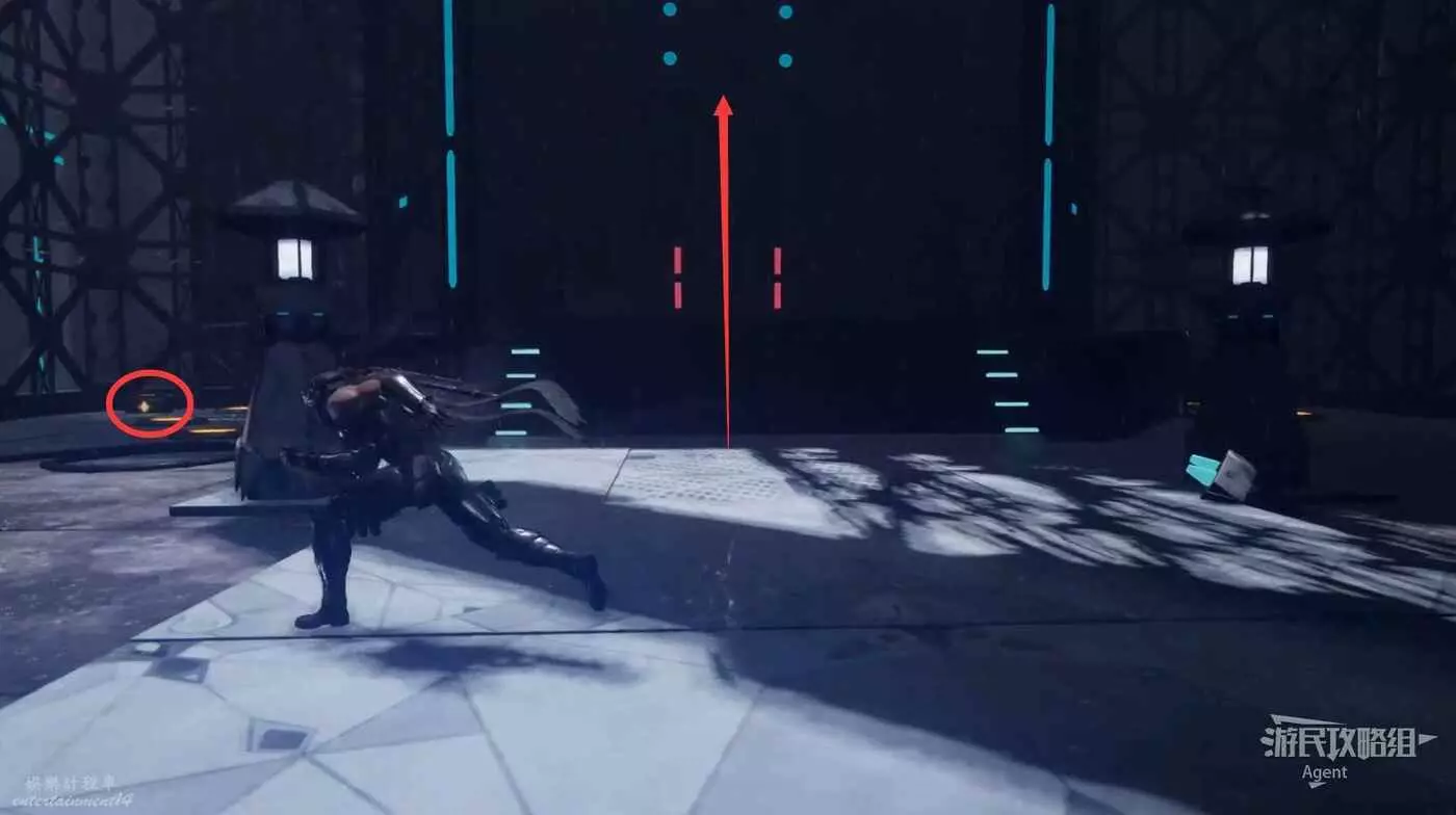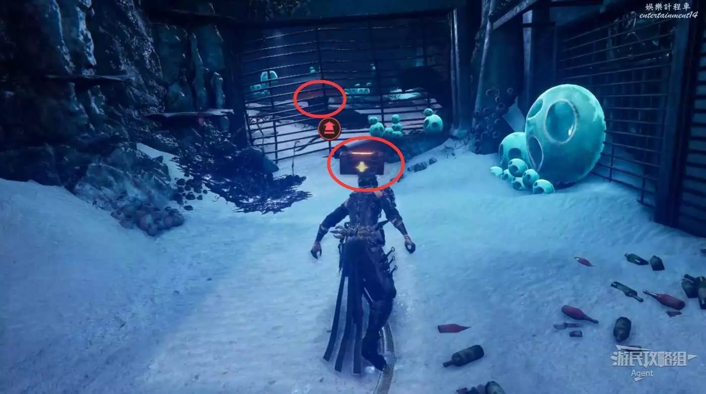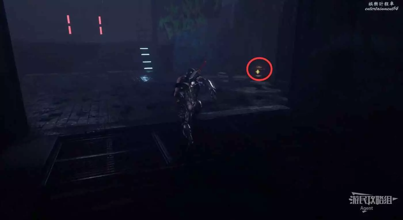 再往前走還有第四台D-0037先驅者,跳上豎井後,用暗器隔著鐳射摧毀機關,鐳射就會暫時關閉,進去拿個寶箱。