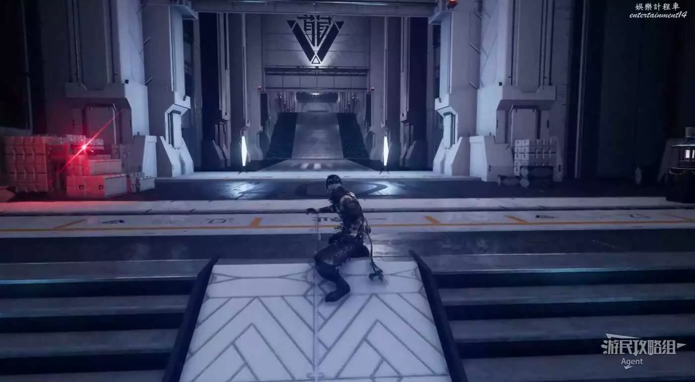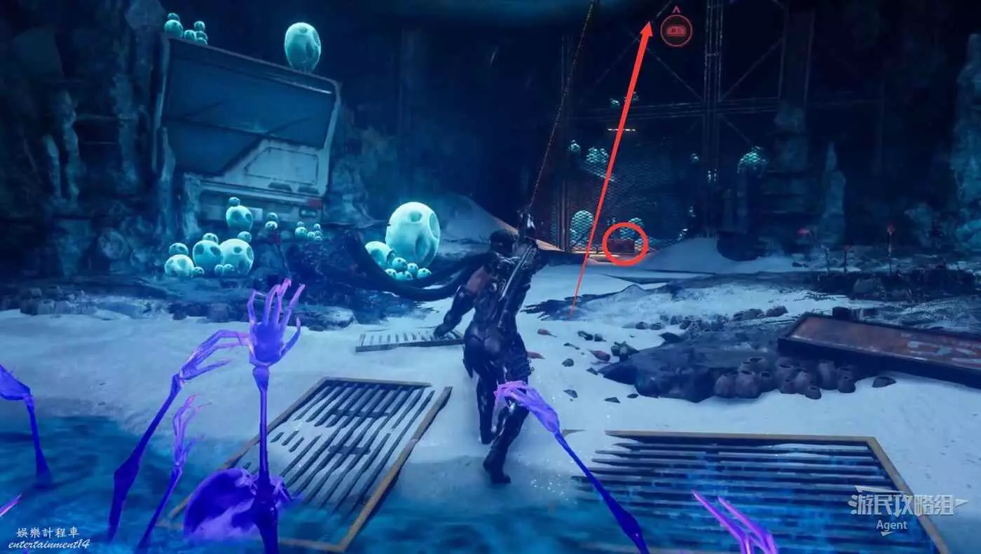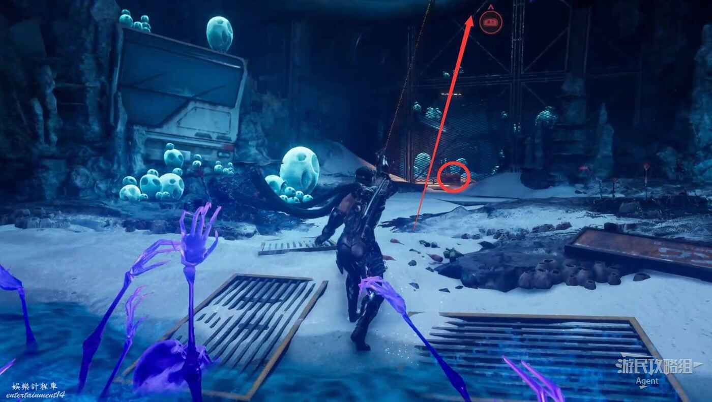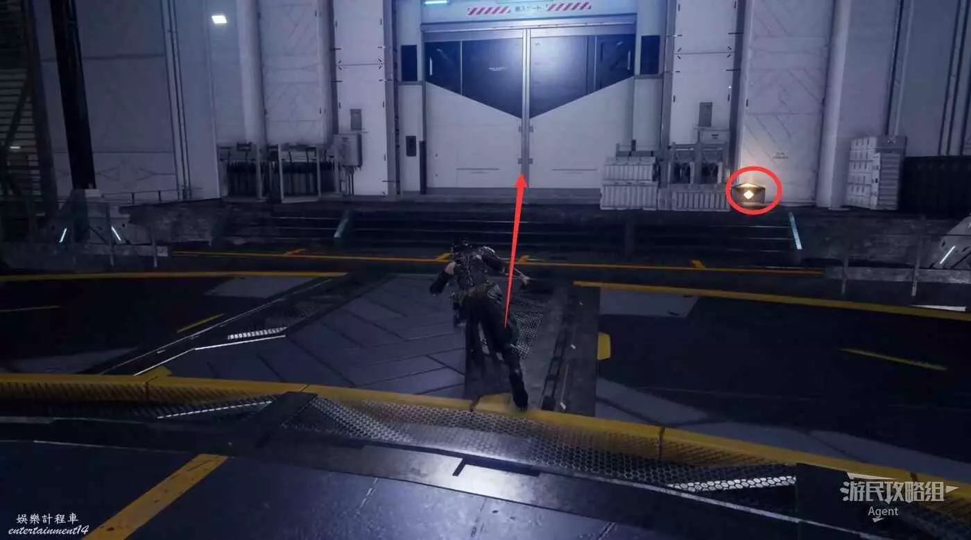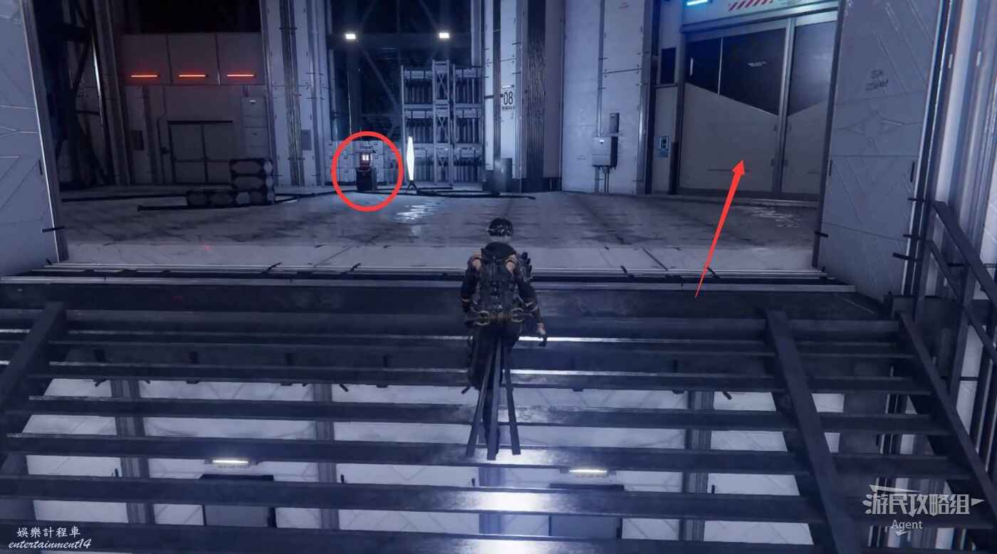 再往前走還有第四台D-0037先驅者,跳上豎井後,用暗器隔著鐳射摧毀機關,鐳射就會暫時關閉,進去拿個寶箱。