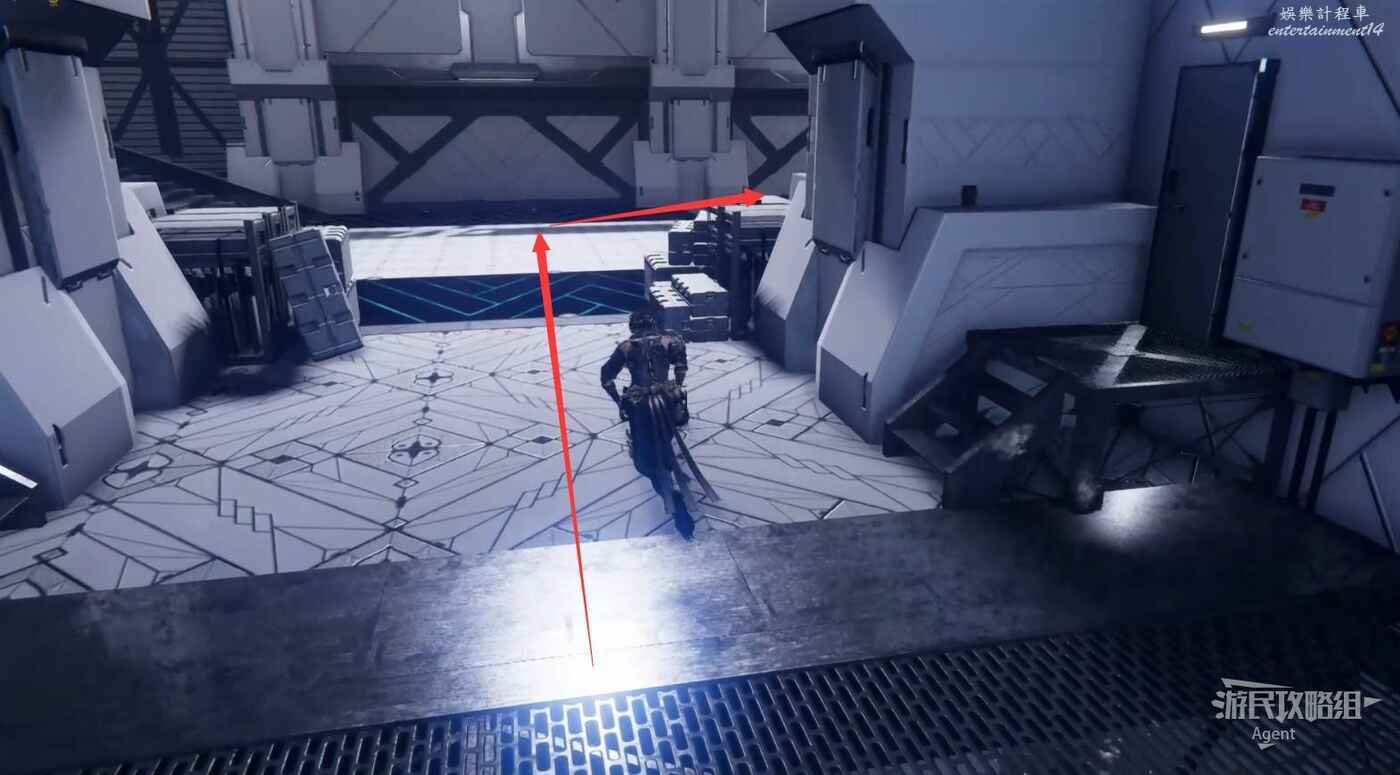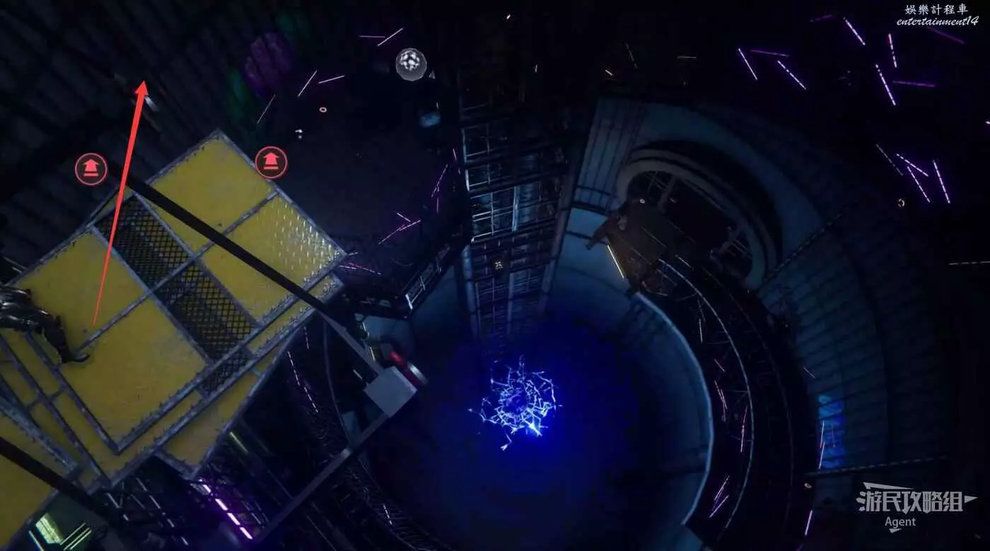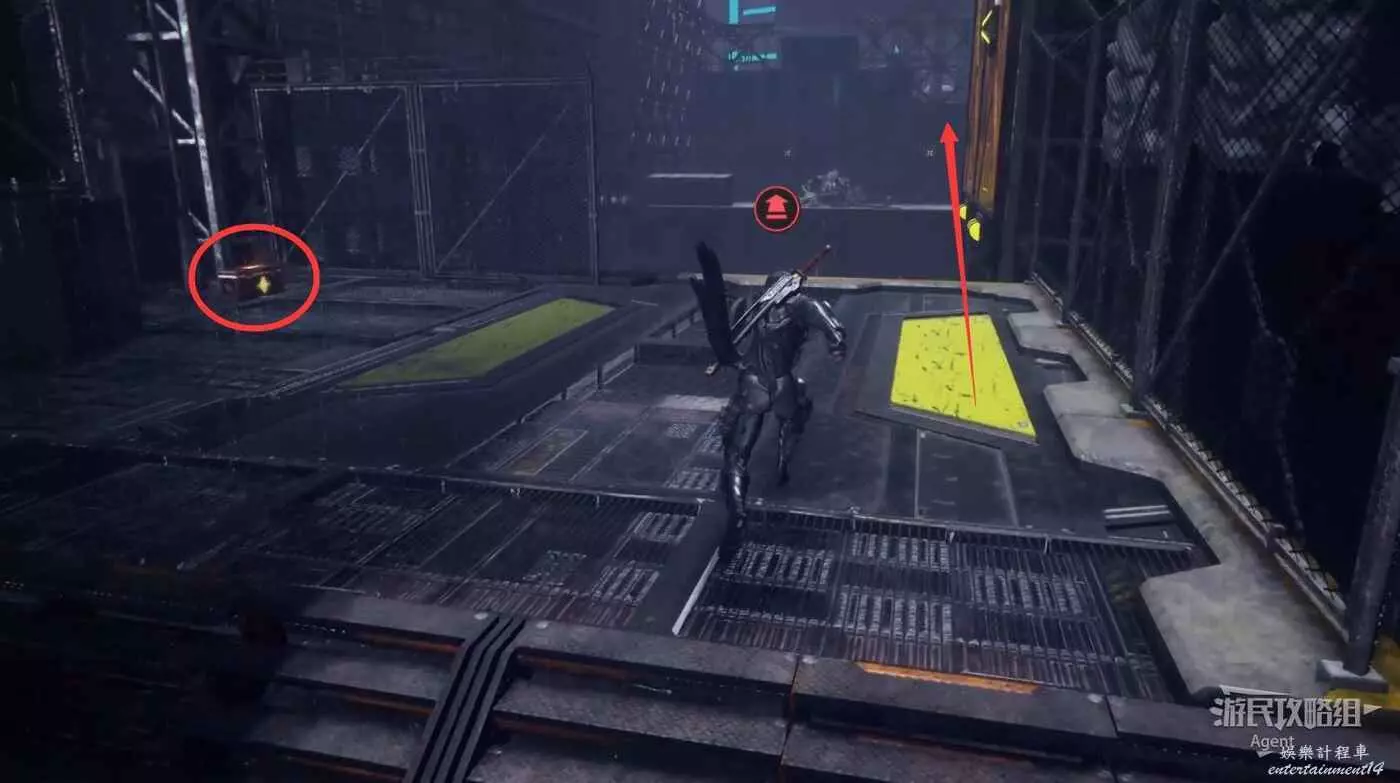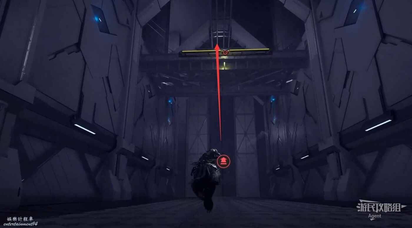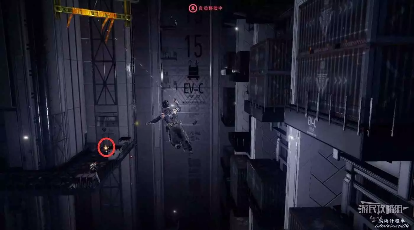 連續蹬牆跳,電梯左邊有個寶箱,然後乘電梯上去。