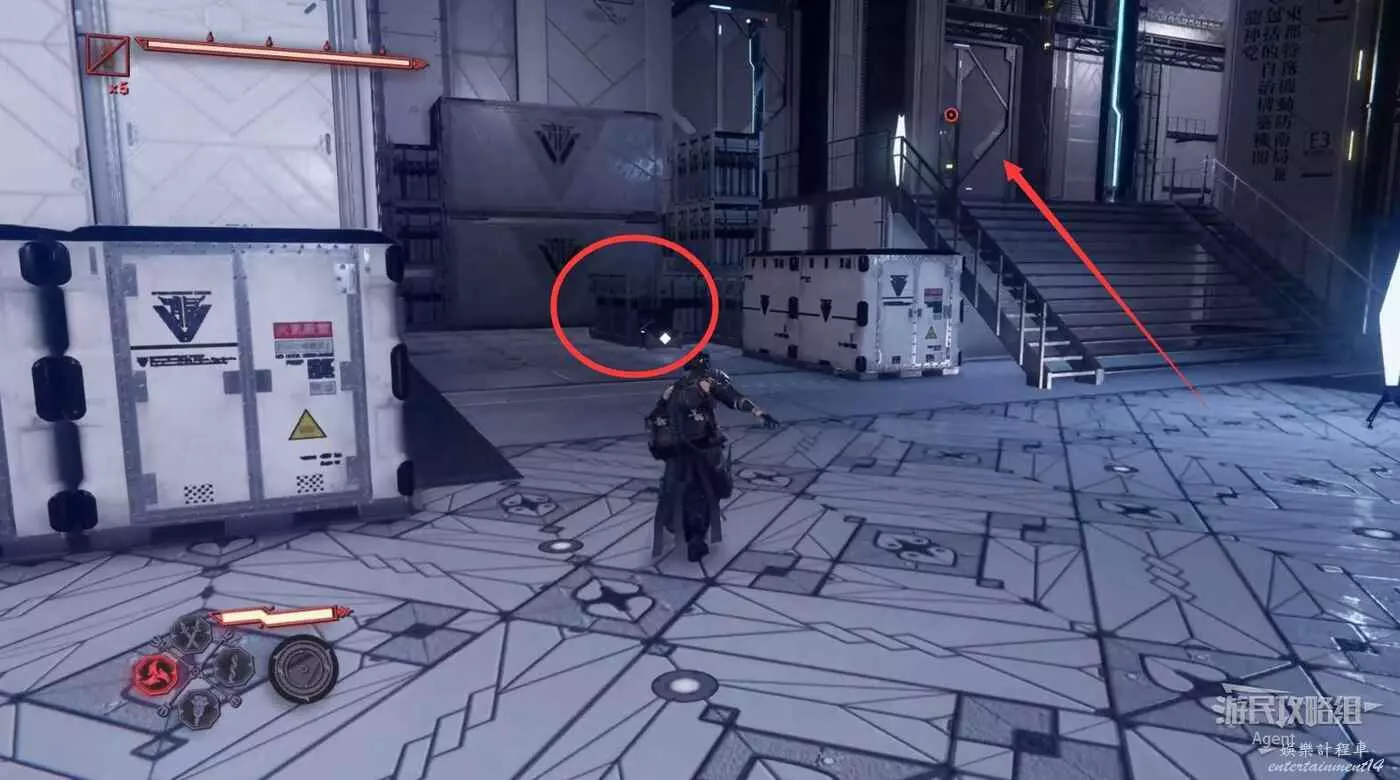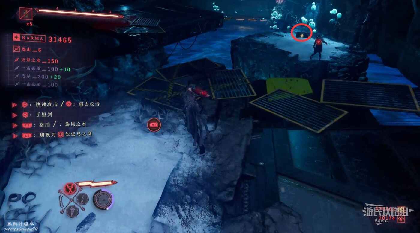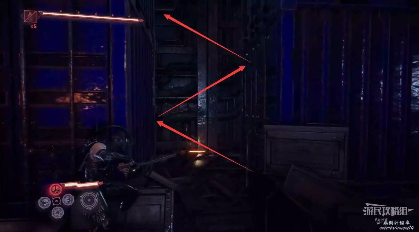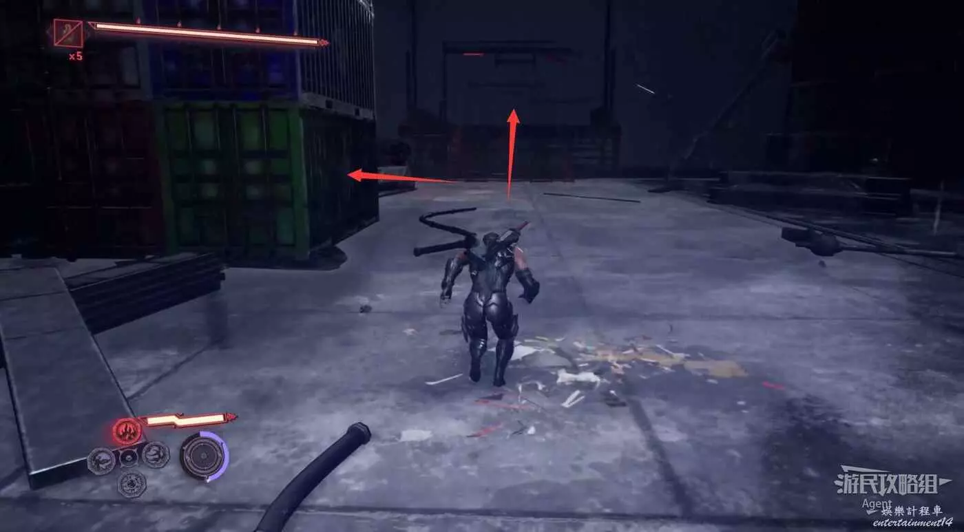 消滅敵人後,先去右邊,兩個集裝箱之間有個寶箱,得到【體術】逆波。利用這兩個靠近的集裝箱組成的豎井,還能往上跳,上面有塊較大的隱藏區域。