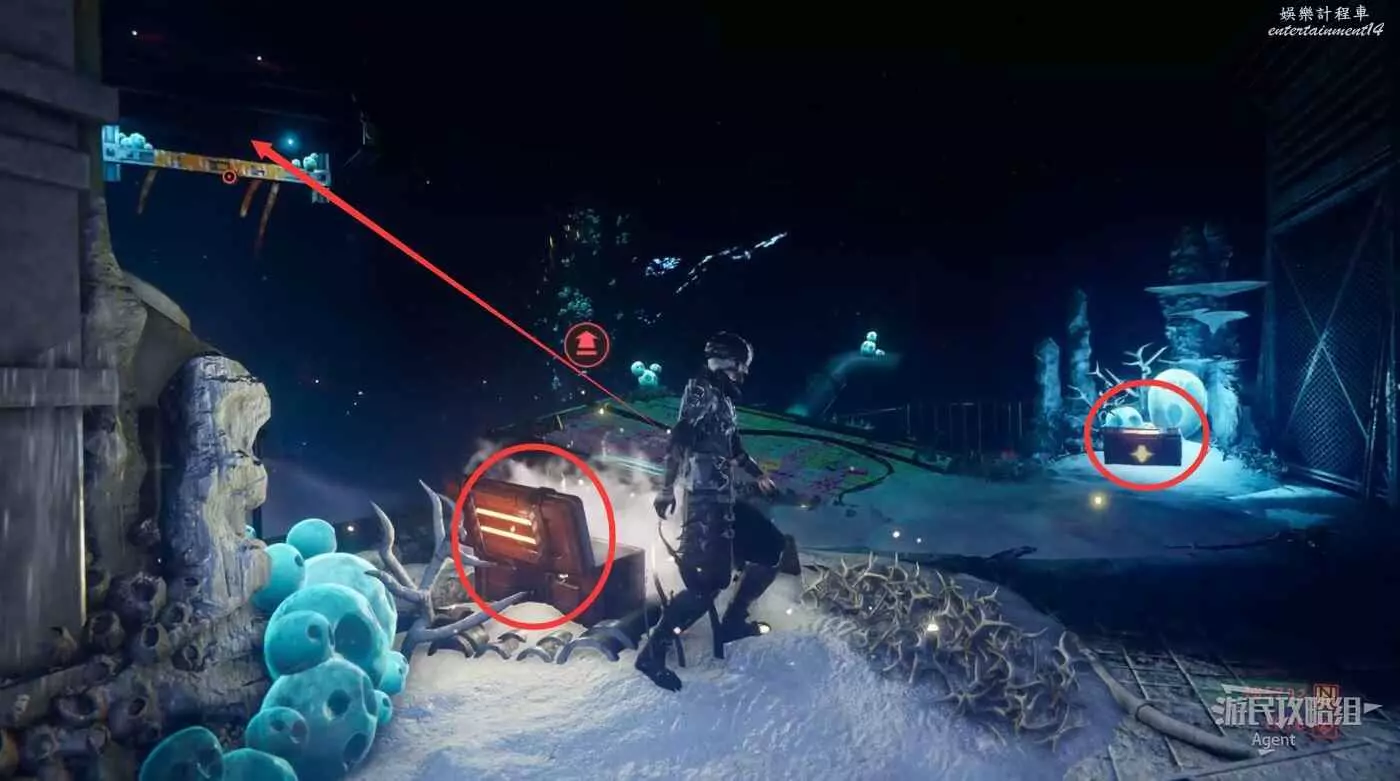 前方拿個寶箱,然後先跳上右邊的大箱子,往右跳過去後,左右兩側各有一個寶箱。