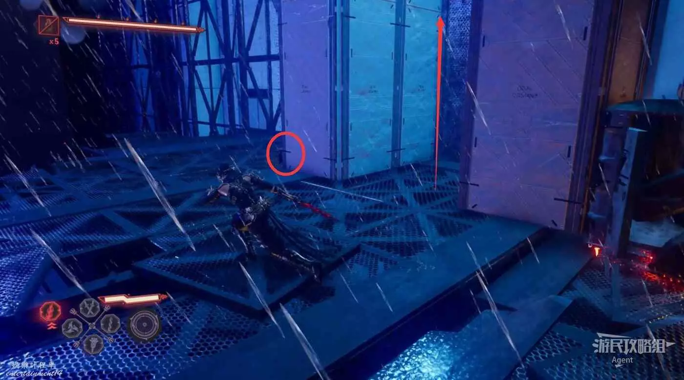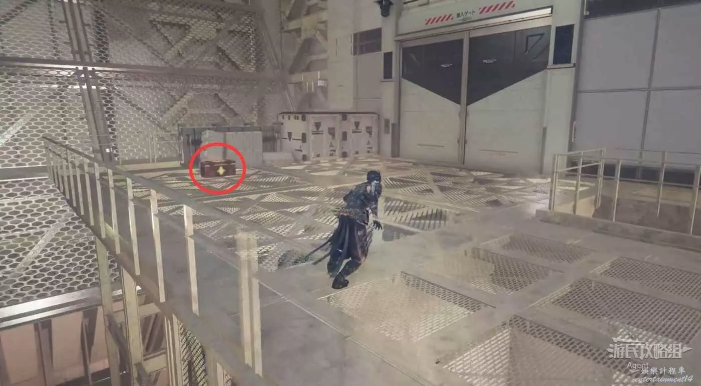 蹬牆跑然後跳上豎井,出門後看右邊有個寶箱。