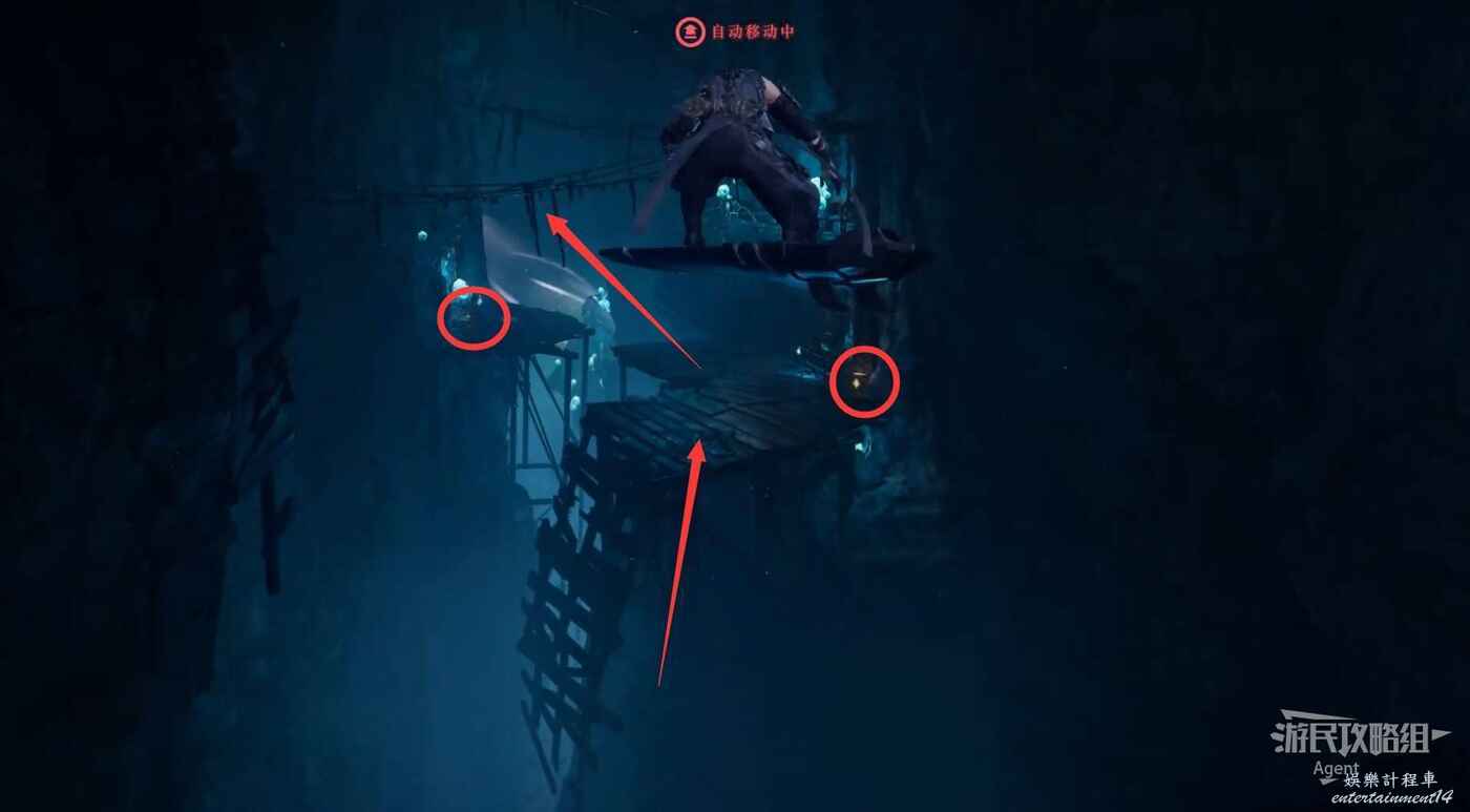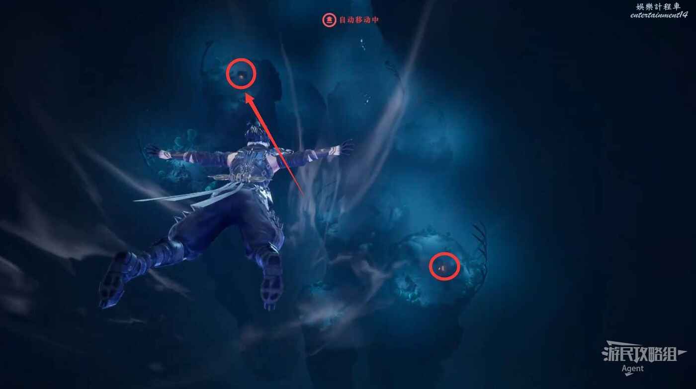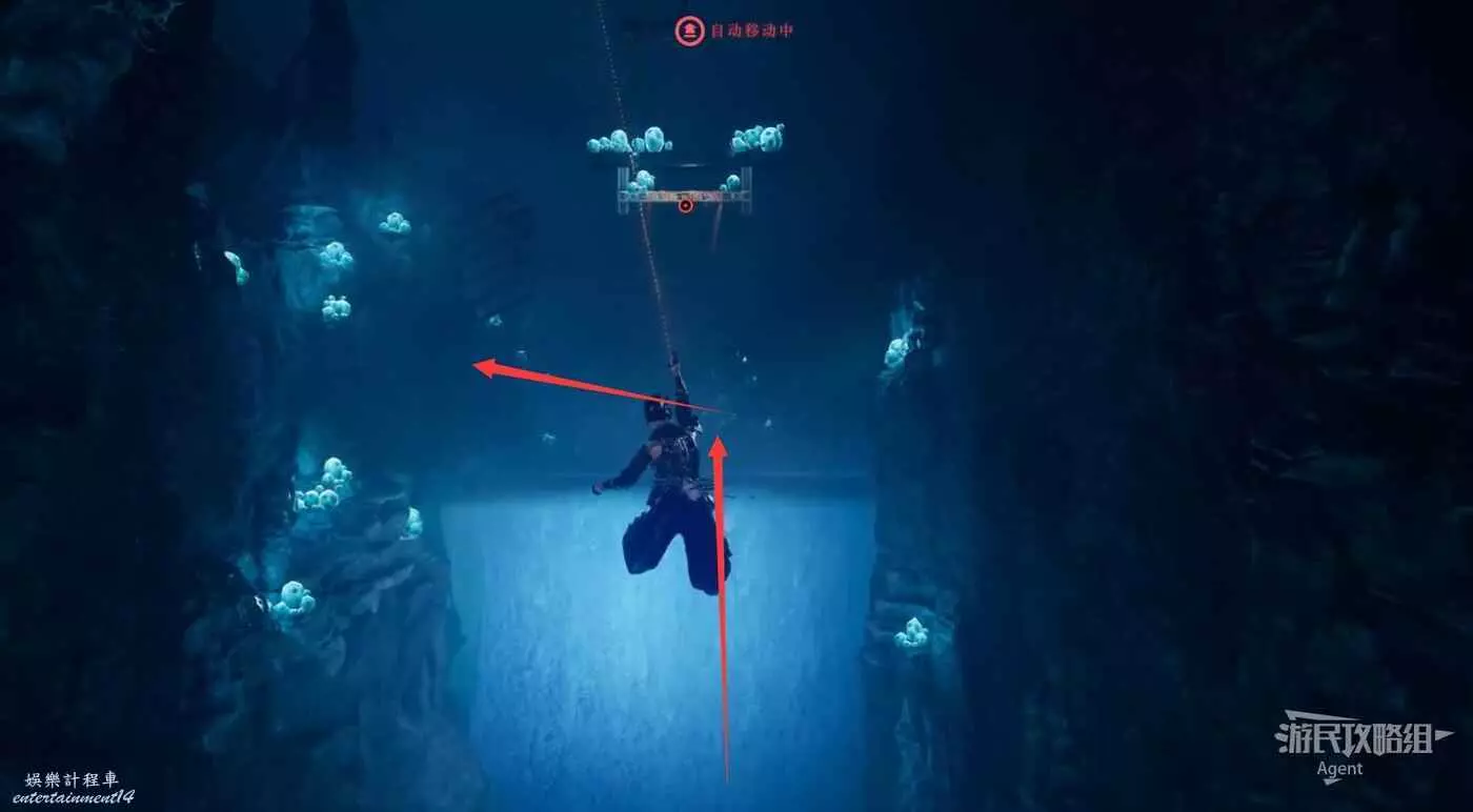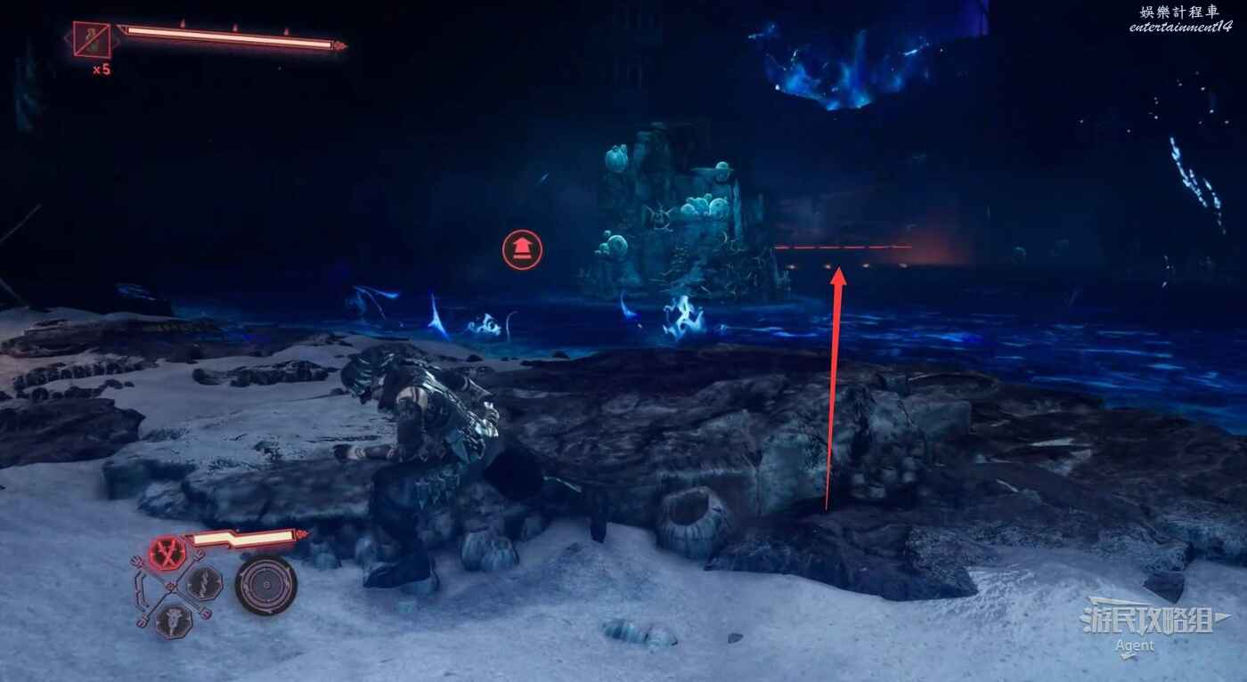 隨風飛回來,用抓鉤跳上來回到水邊,沿著發光痕跡去對面傳送門處。
