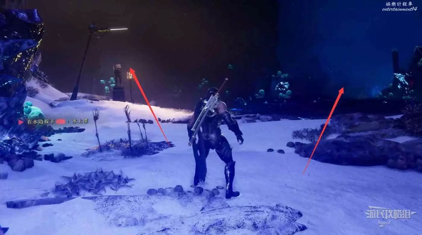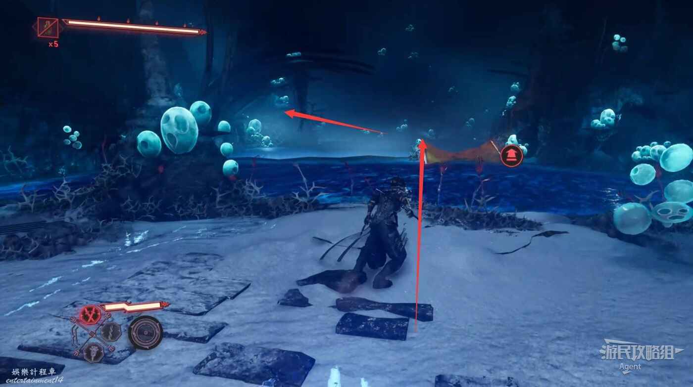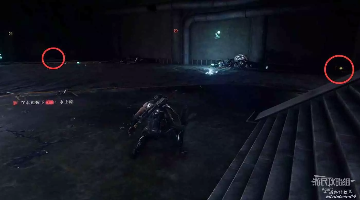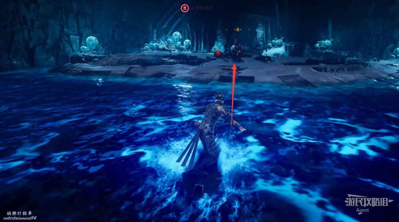 隨風飛回來,用抓鉤跳上來回到水邊,沿著發光痕跡去對面傳送門處。