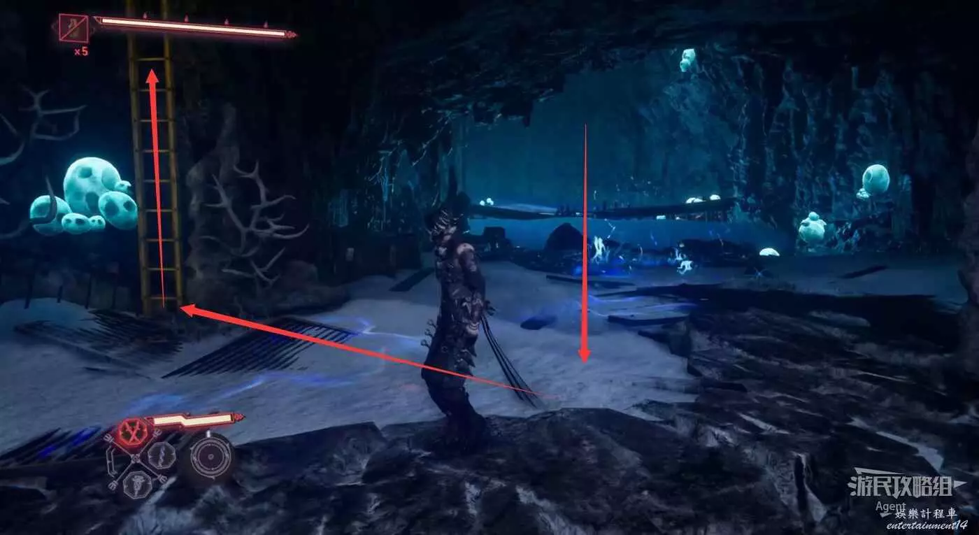 然後跳上豎井,看背後,牆角發紫光的東西就是華苦無·天。