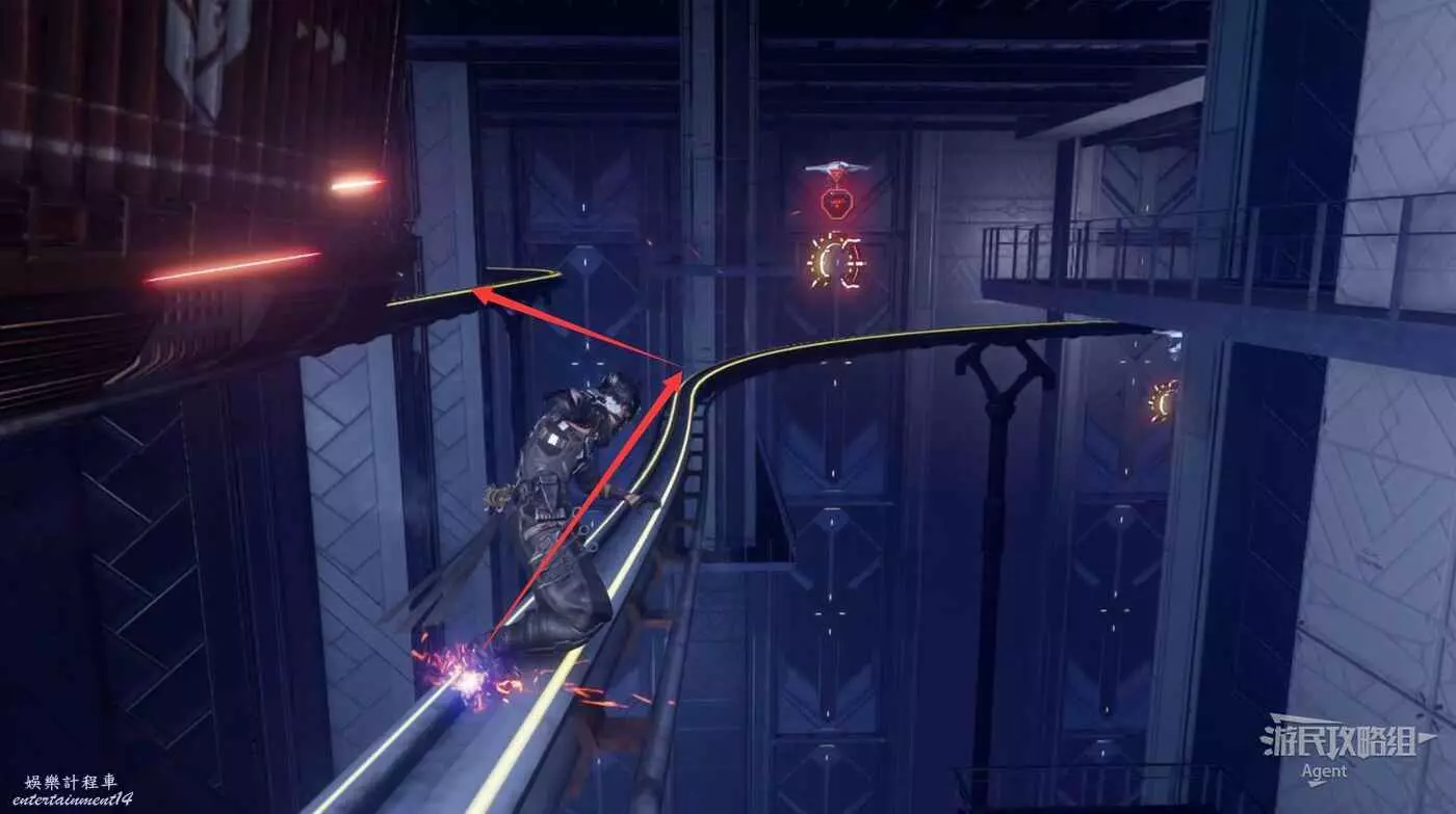 滑過軌道,落地後蹬牆跑過去,跳上豎井。