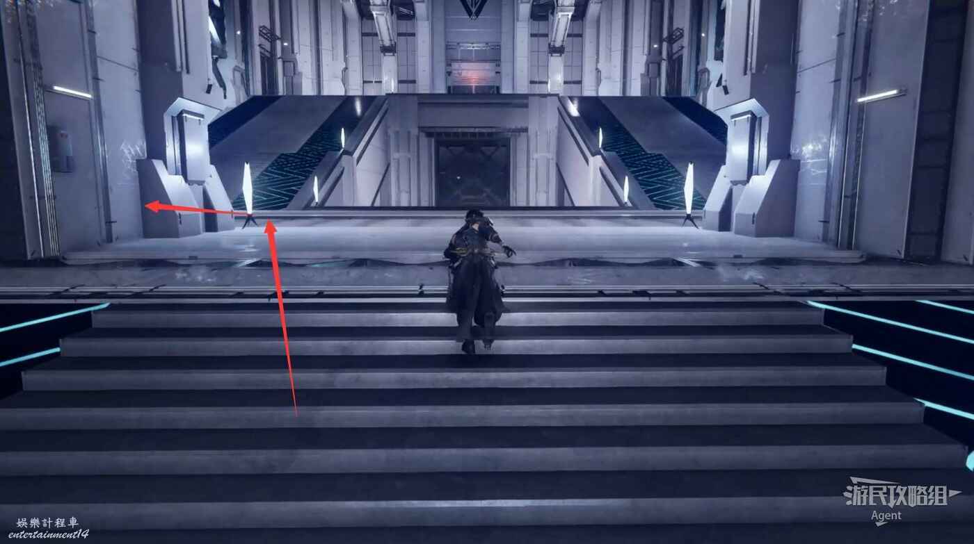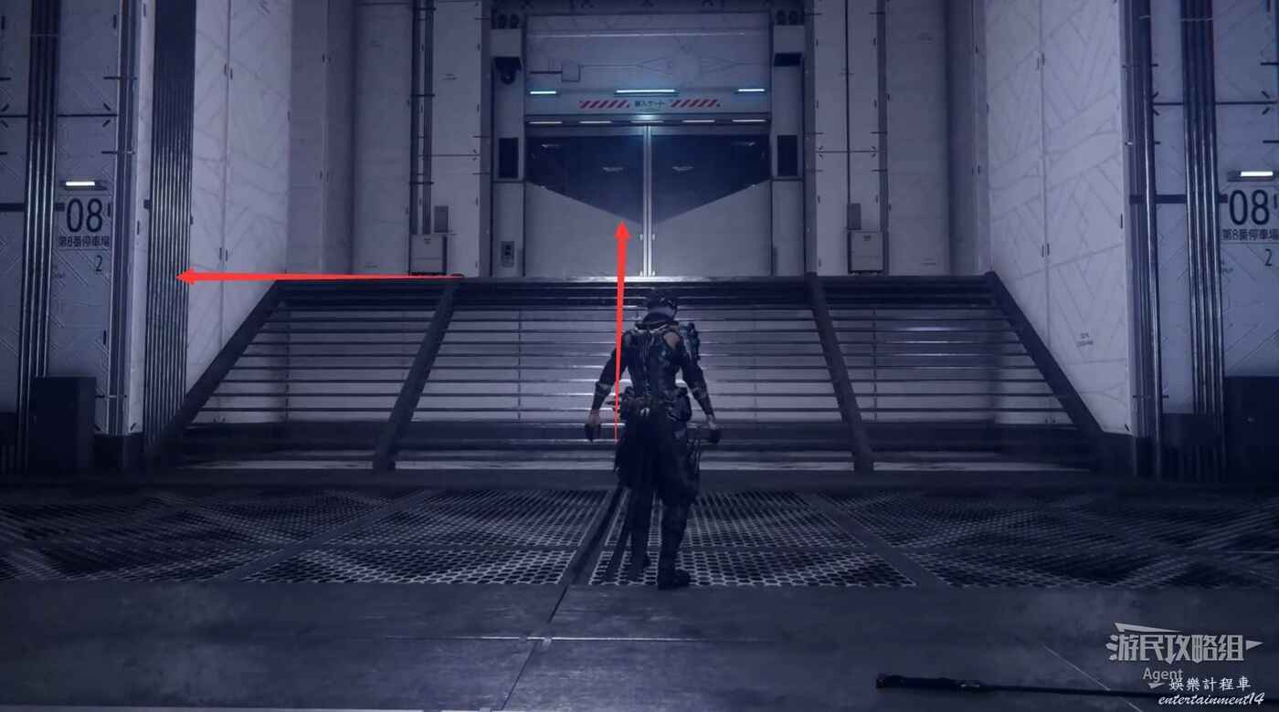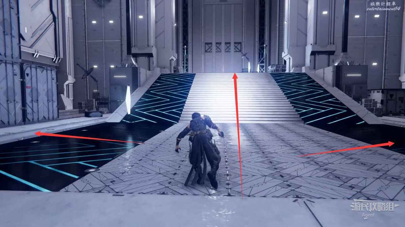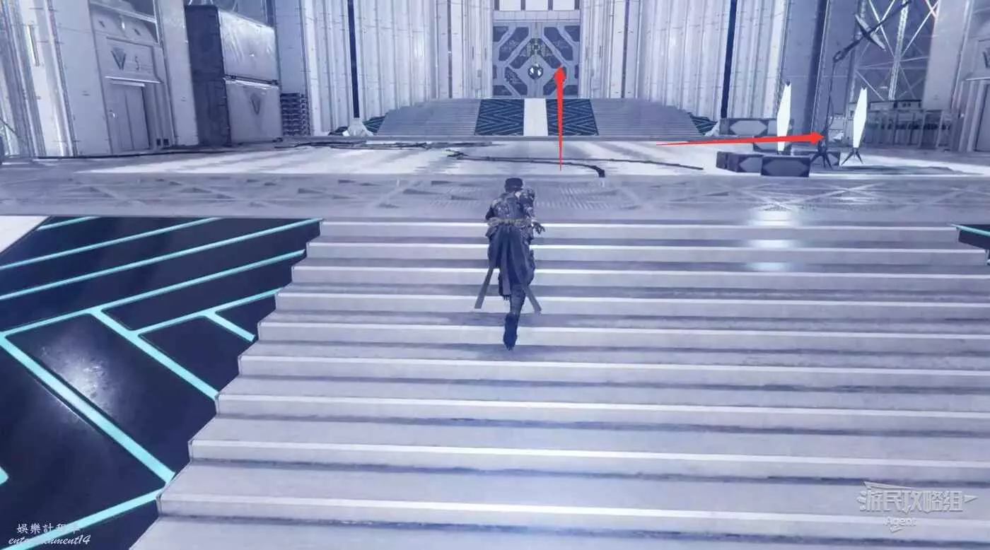 走上長階梯,去右側有個寶箱,然後去中間開門。