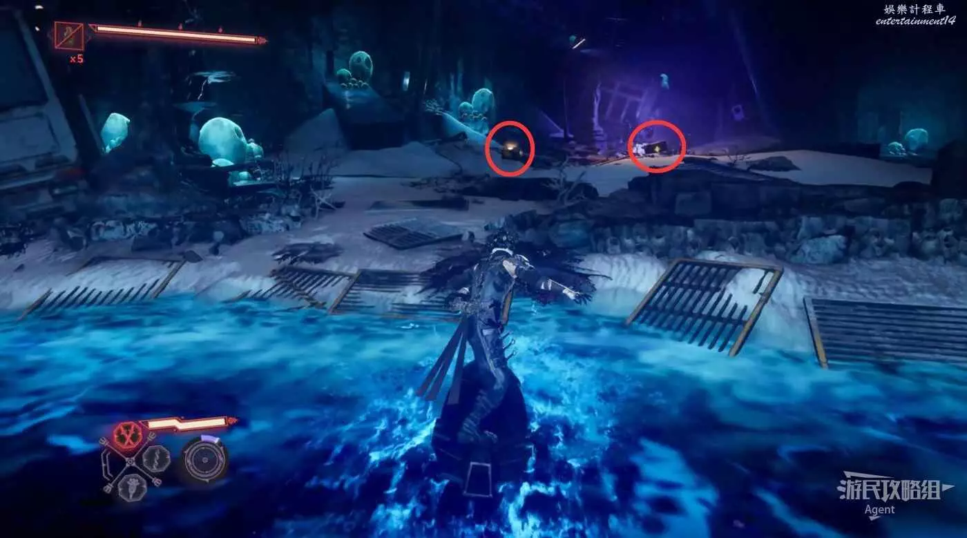 注意剛從軌道下到水裡時,跳上去有兩個寶箱。消滅上面的敵人並拿完兩個寶箱後,先別急走,繼續往上跳(下圖右邊)還有個寶箱。