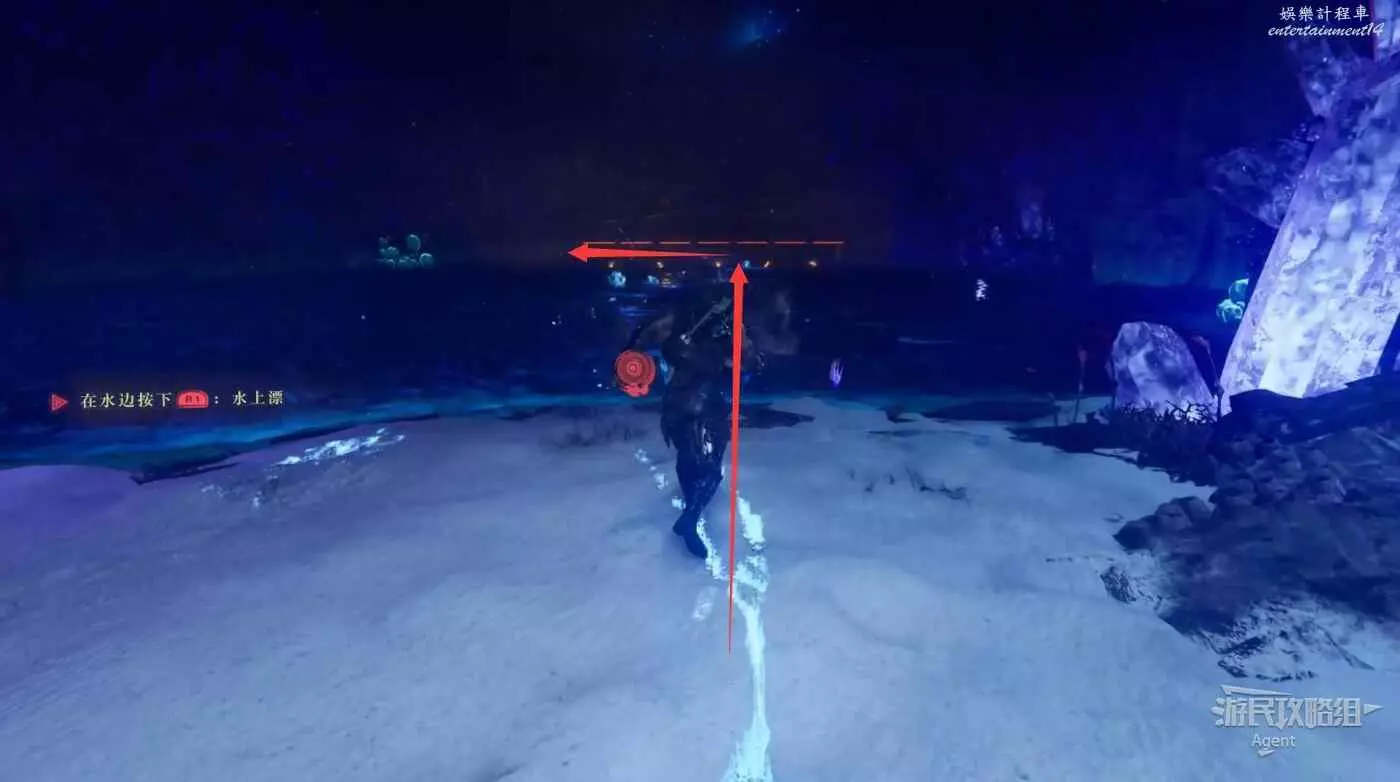 來到水邊,看到水面上有目標逃跑的發光痕跡,這是主線方向,衝浪到中間小島上有三個寶箱。