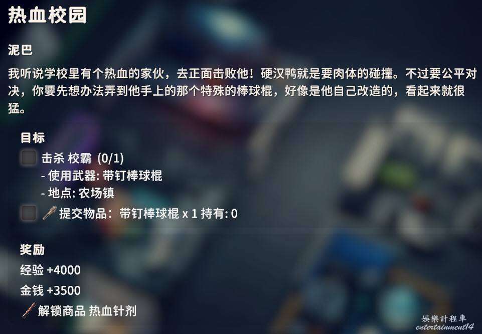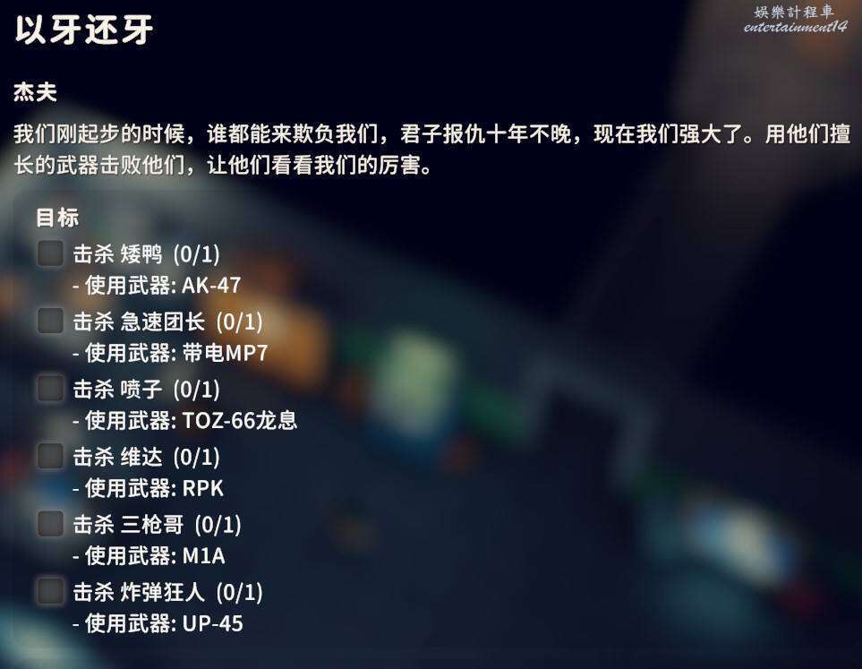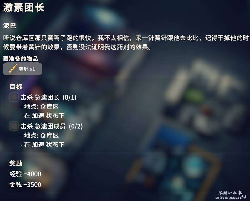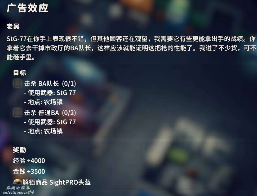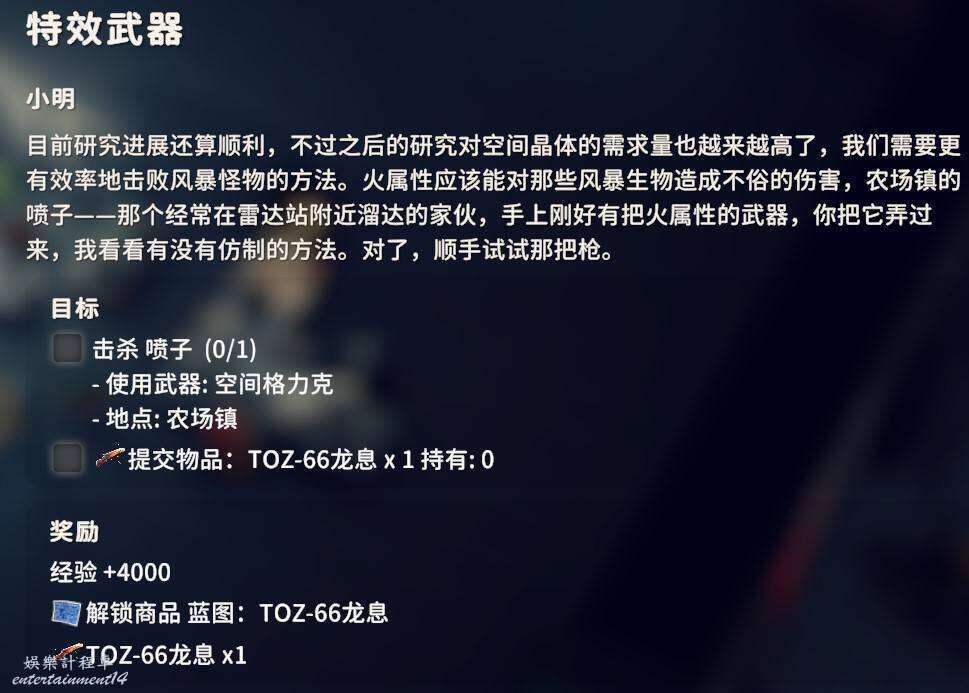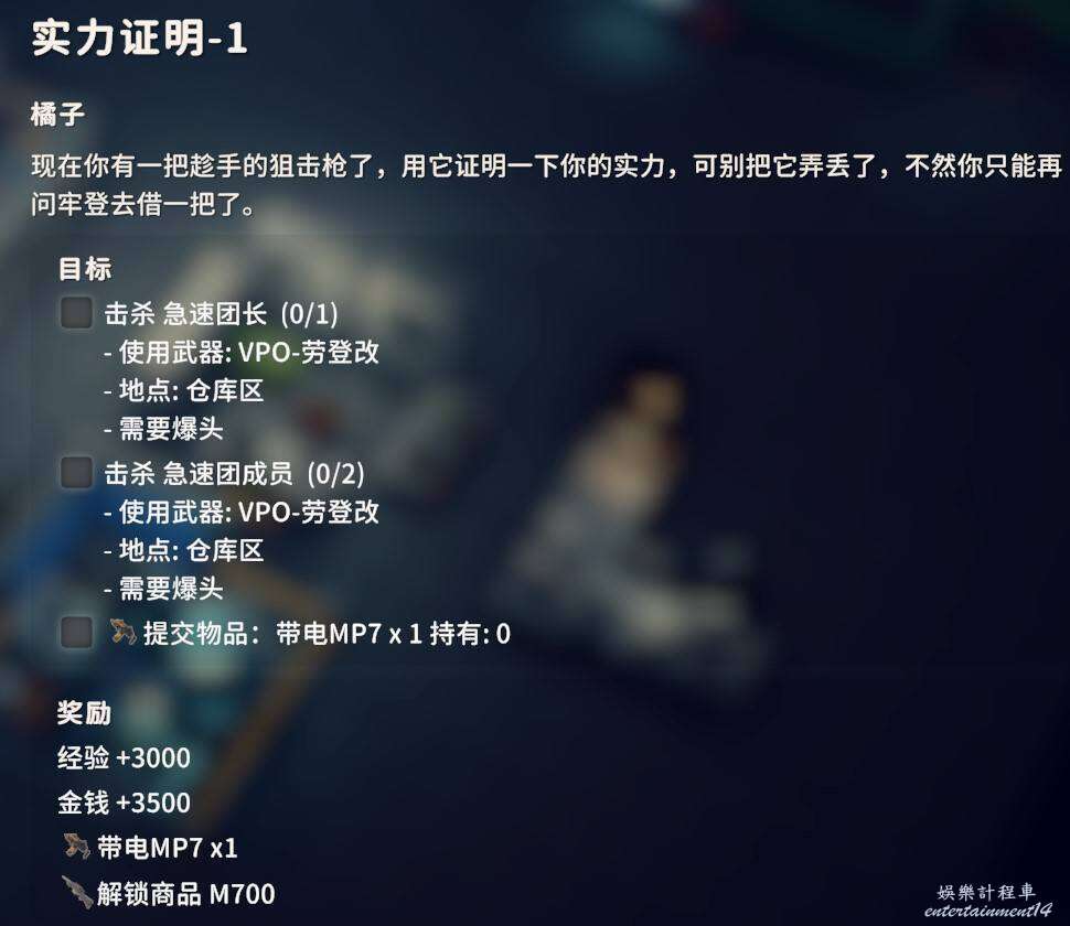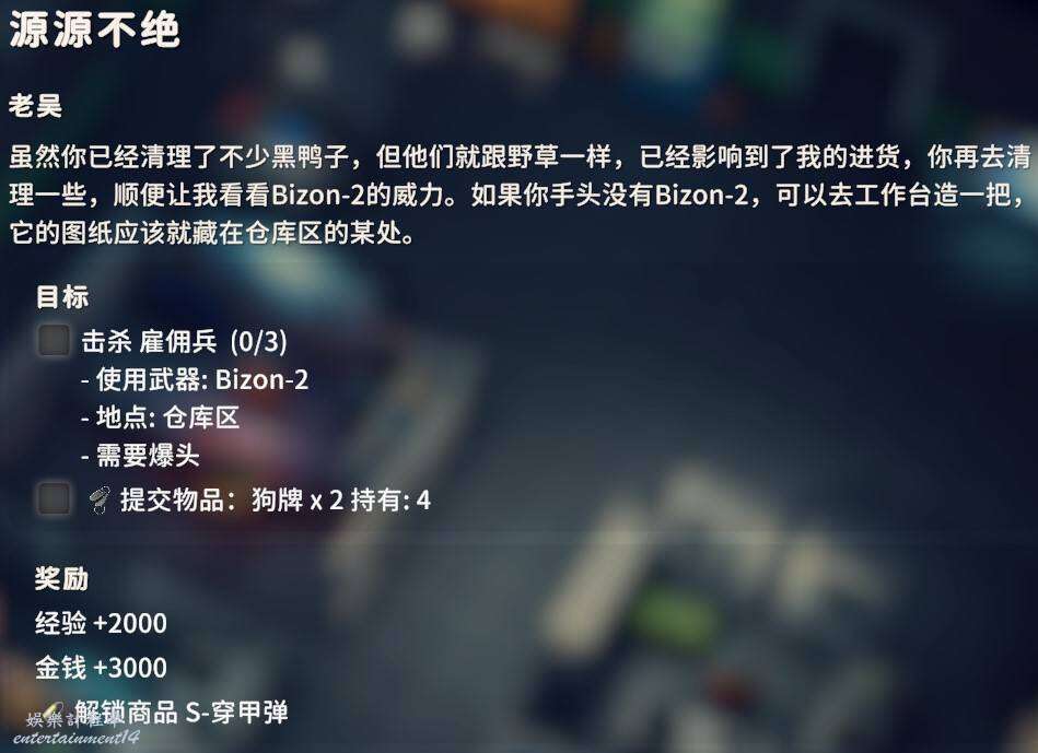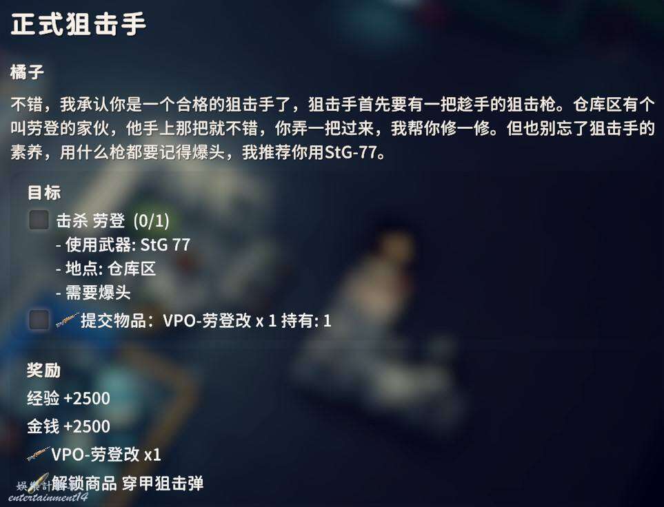 用對應武器爆頭擊殺倉庫地區的黑鴨子3只即可,武器圖紙在前面任務過程中應該已經入手了,同時交付狗牌X2。