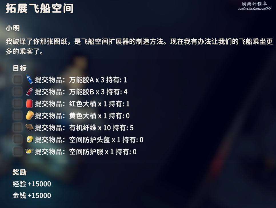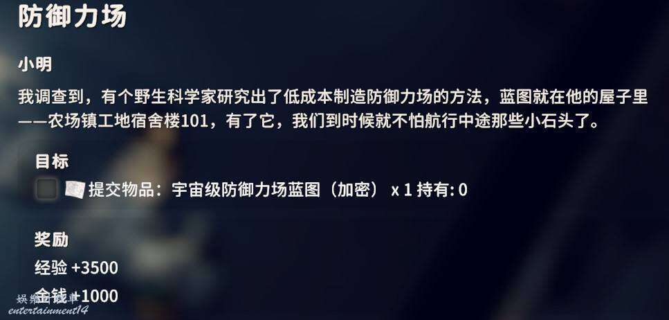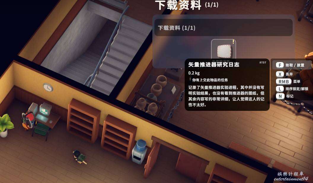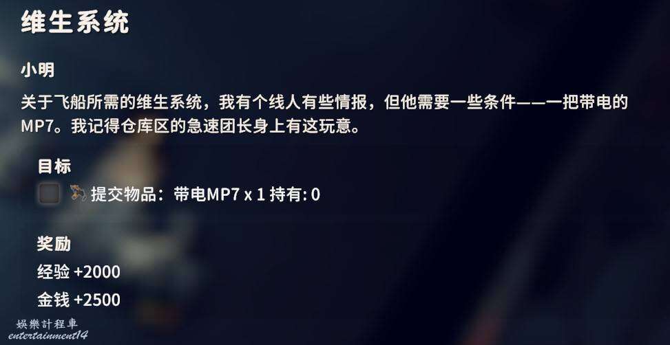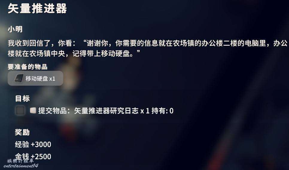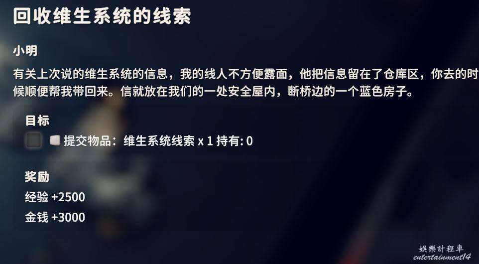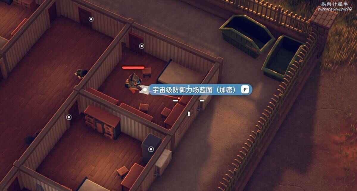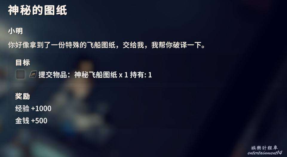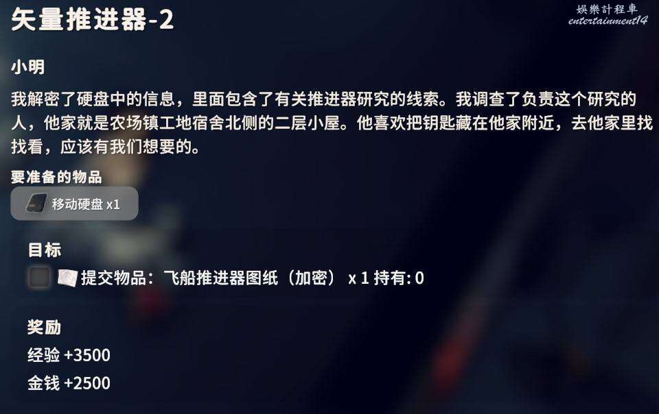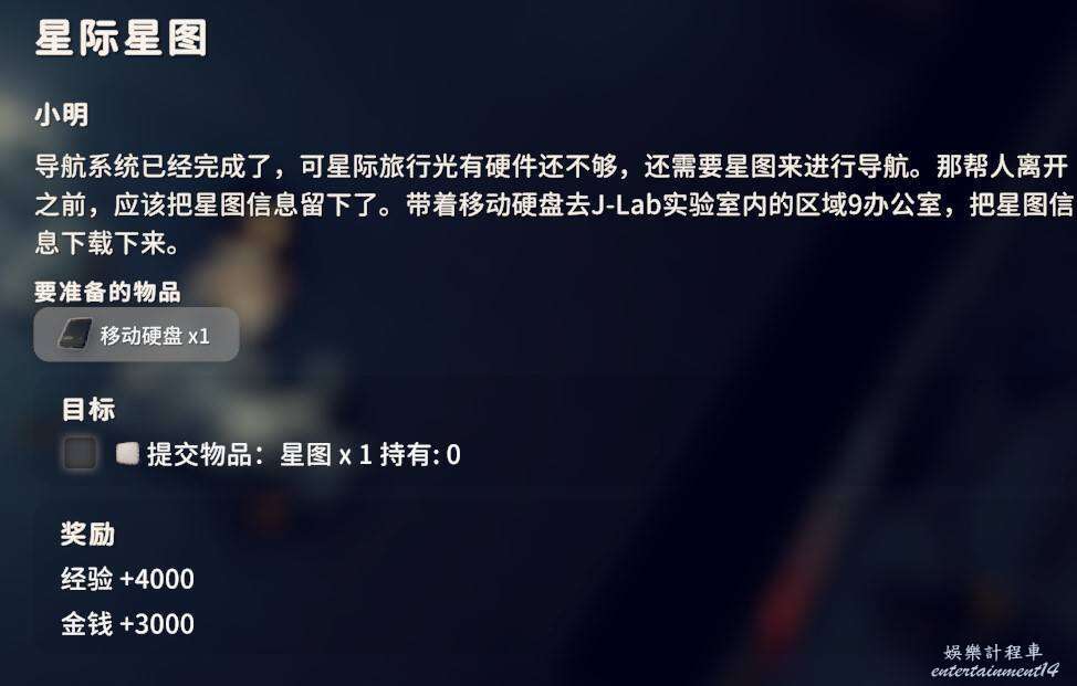 2.是否拾取下圖角色所在位置的資料物品(需要移動硬碟),並完成神秘的圖紙、拓展飛船空間、安裝空間拓展器三個任務(隱藏任務,需要拾取神秘圖紙後回到地堡小明哪裡才會出現感嘆號接任務)。