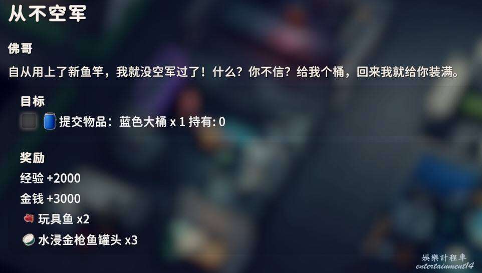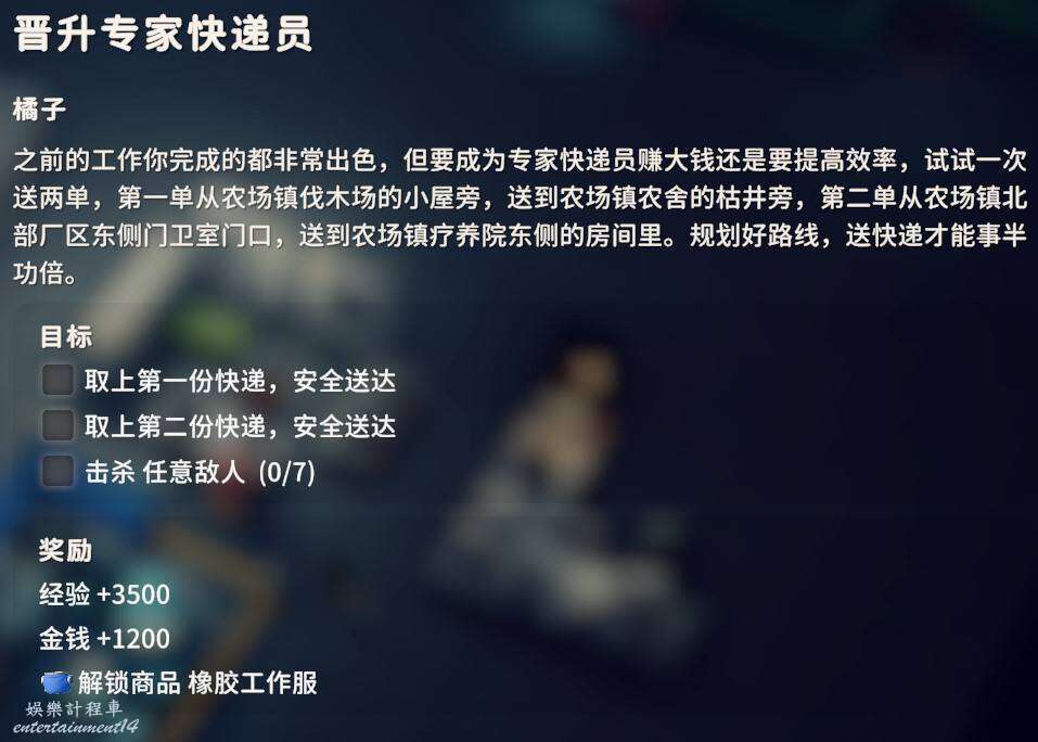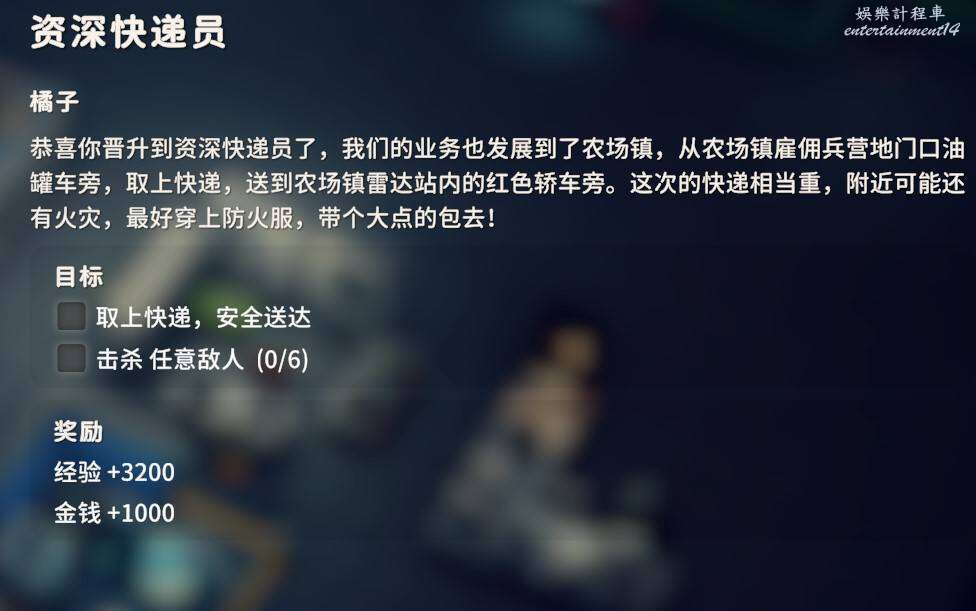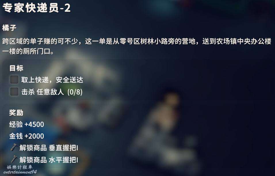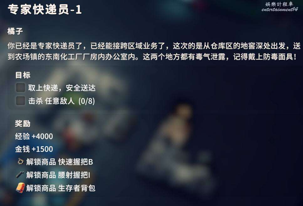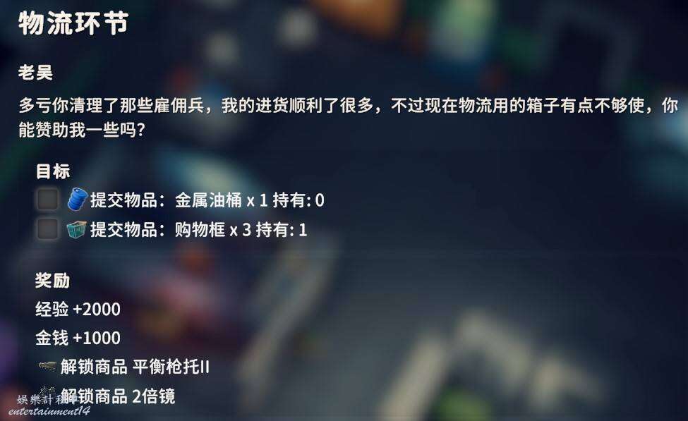 交付金屬油桶X1、購物筐X3,金屬油桶配方能夠在倉庫區的西廠區撤離點的下方找到,購物筐在零號區矮山的神秘商人處可以直接購買。