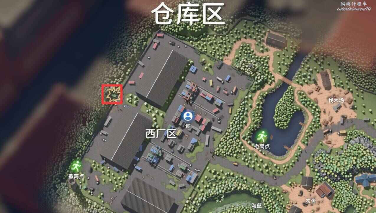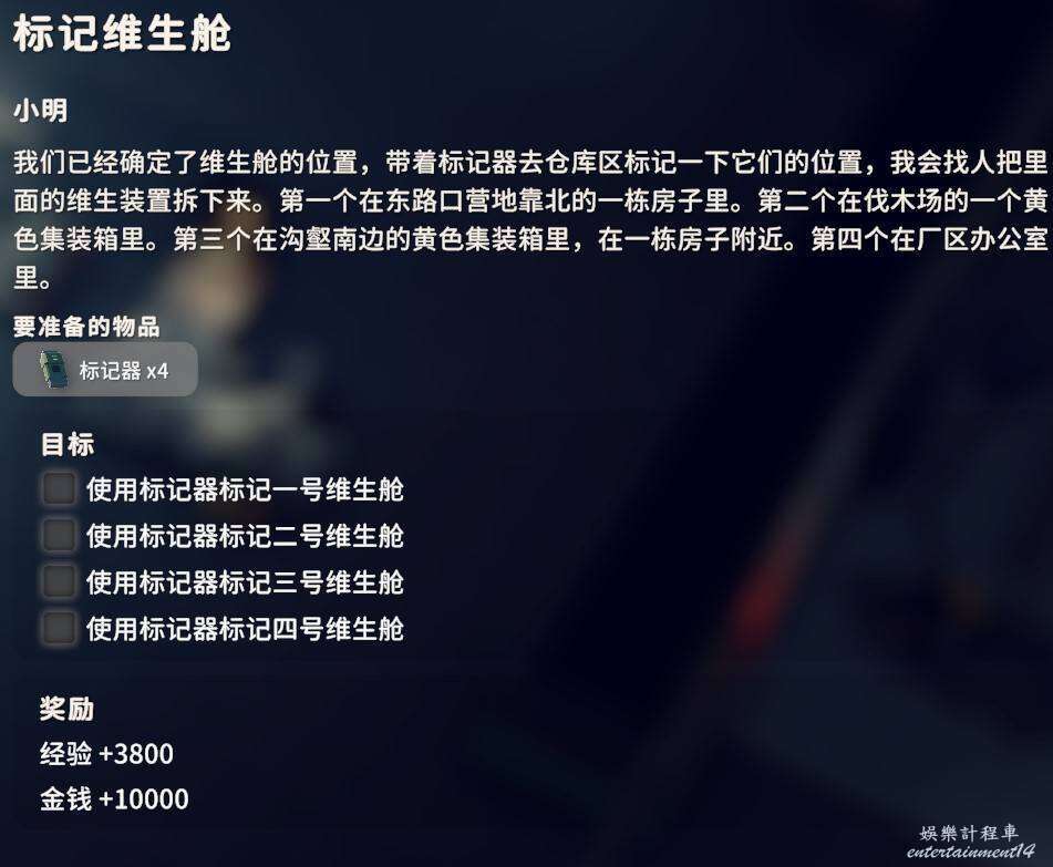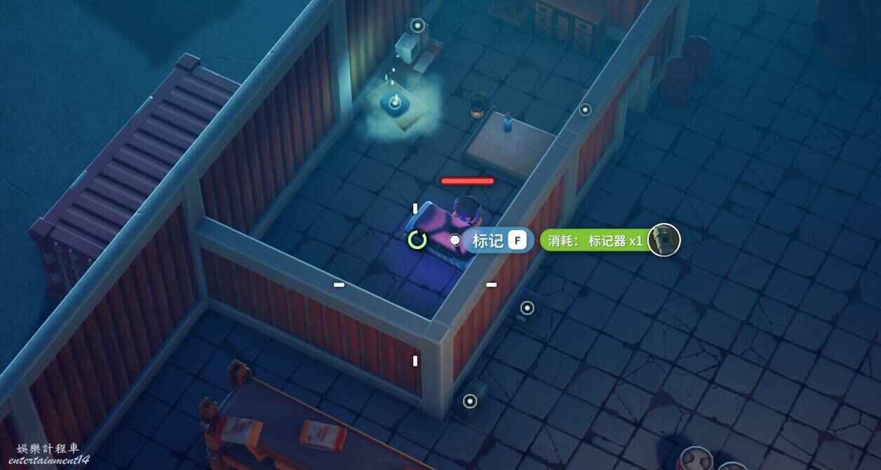 帶上四個標記器前往倉庫區,下圖4個點位元全部互動即可完成任務。
