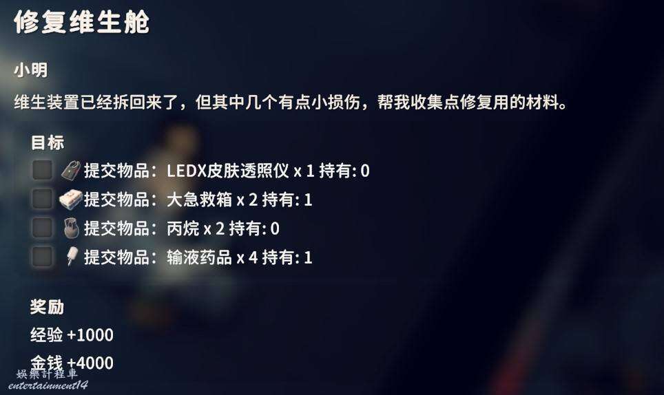 提交LEDX皮膚透照儀X1、大急救箱X2、丙烷X2、輸液藥品X4,除了透照儀其他三個都可以在零號區矮山上的神秘商人那裡購買。透照儀在療養院這個房間會出,進門需要療養院機房鑰匙。