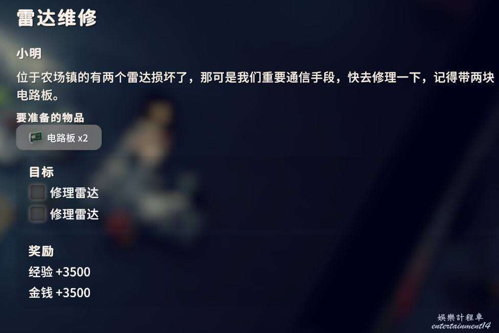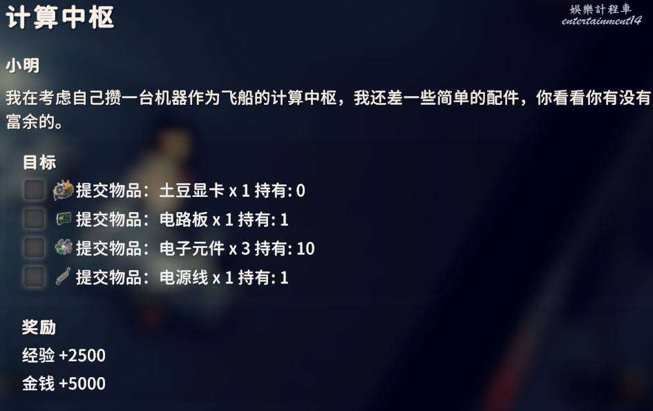 提交土豆顯卡X1、電路板X1、電子元件X3、電源線X1,土豆顯卡只能搜刮出來多去農場鎮的遊戲廳宿舍等地方,電路板、電子元件都可以在工作臺製作或者分解出來,電源線地堡商店直接購買。