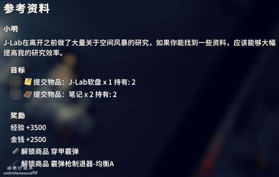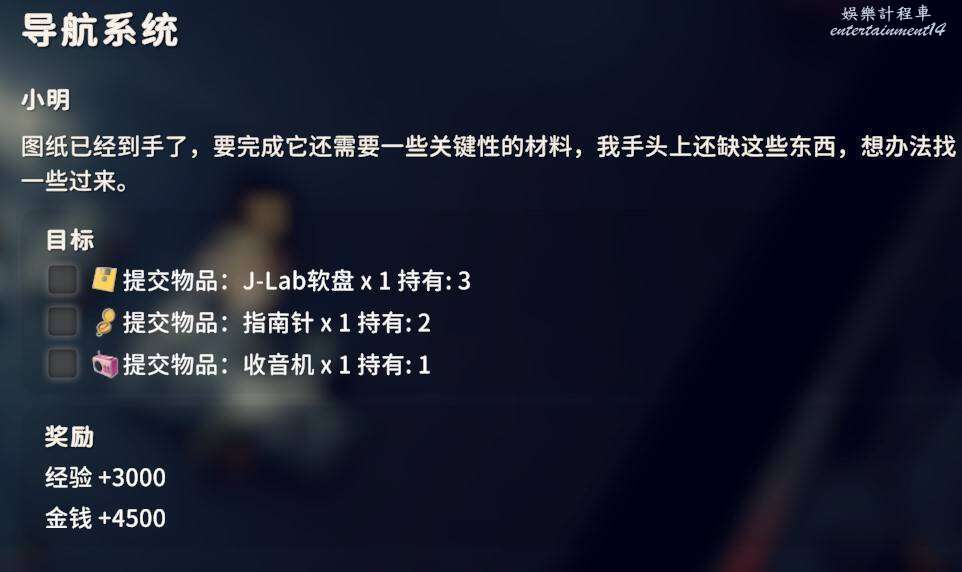 交付J-Lab軟碟X1、指南針X1、收音機X1即可完成任務。