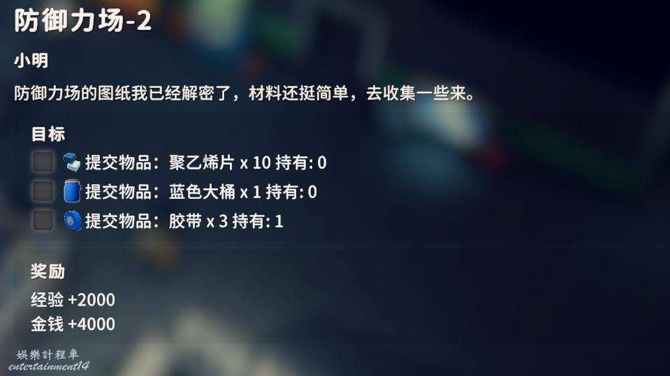 交付聚乙烯片X10、藍色大桶X1、膠帶X3即可完成任務,聚乙烯片直接分解塑膠類物品都會給,藍色大桶可以工作臺製作,膠帶矮山商人有賣。
