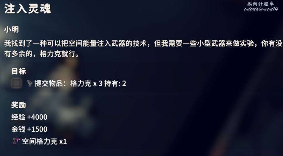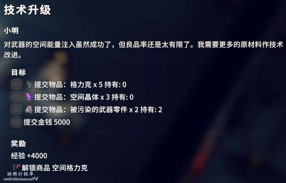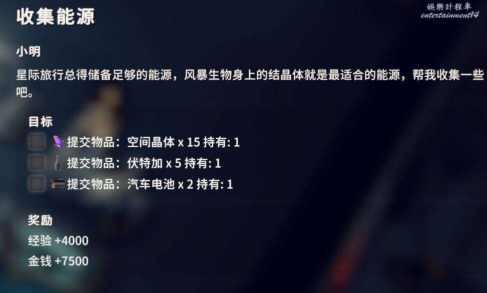 交付空間晶體X15、伏特加X5、汽車電池X2,這三個東西空間晶體和伏特加獲取方式不做過多說明,汽車電池可以通過平時搜刮獲得,但是這玩意很重,平時一定要記得撿。